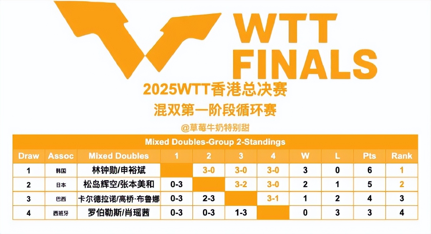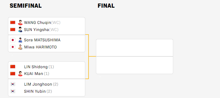 混雙半決賽的對陣圖:王楚欽/孫穎莎VS張本美和/松島輝空、林鐘勛/申裕斌VS林詩棟/蒯曼,國乒有希望在決賽中碰面。