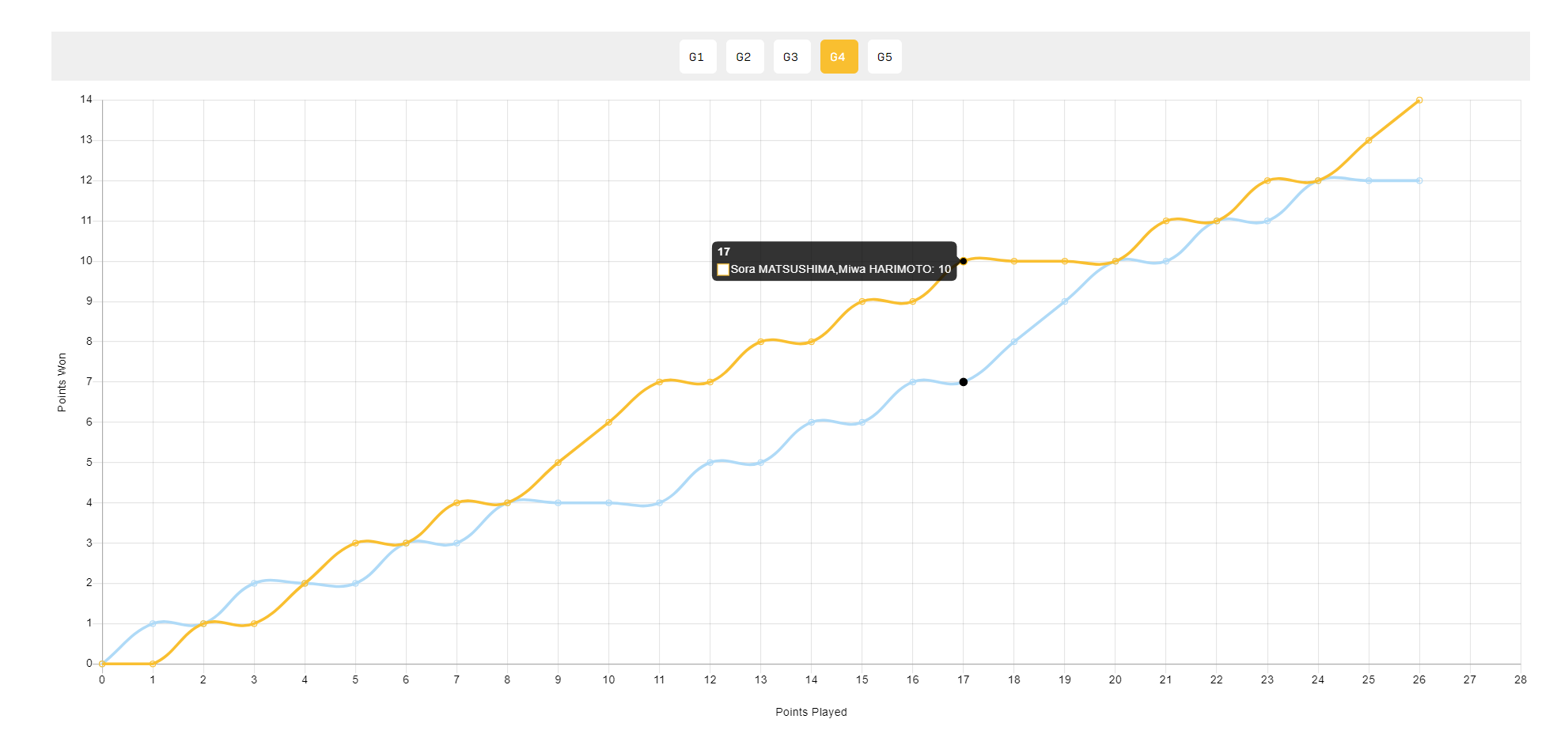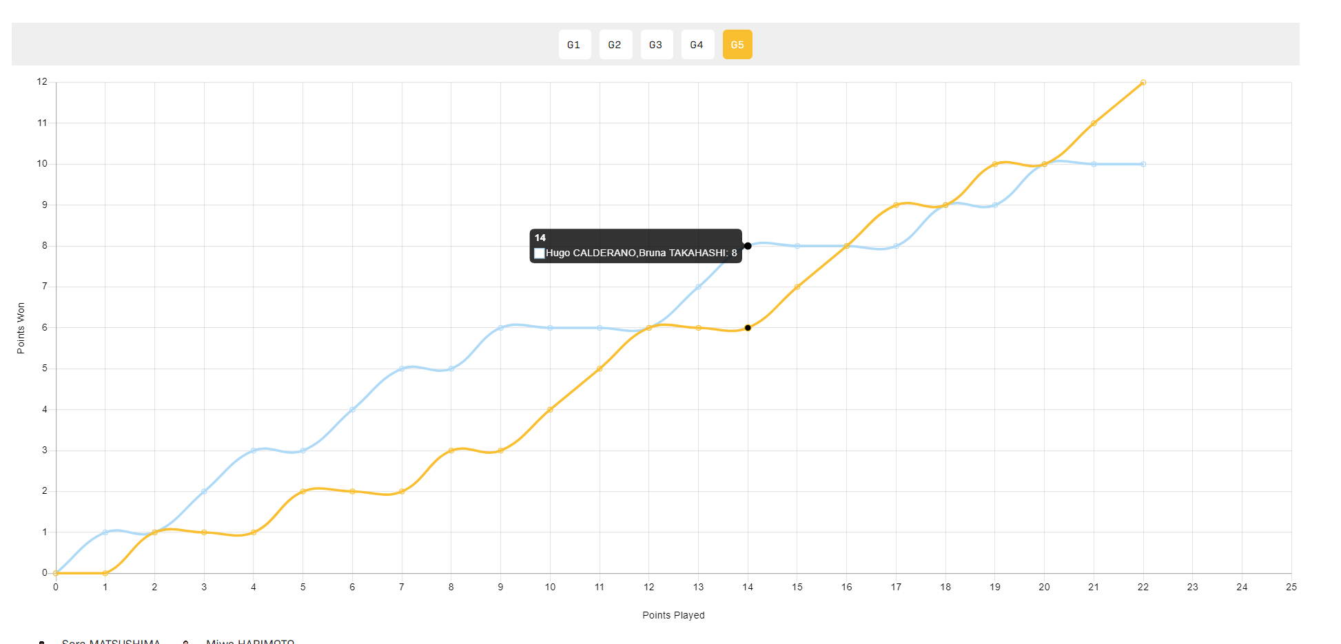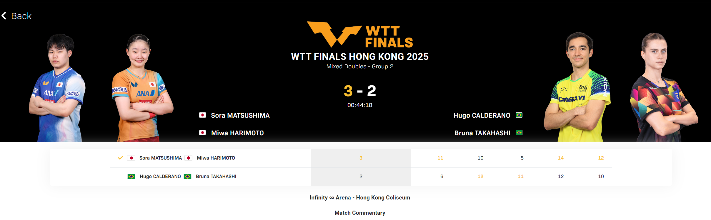 決勝局日乒組合是逆轉取勝,開場雨果/布魯娜6-3領先張本/松島,但兩位日乒的超級天才沒有慌亂,他們追到6-6、8-8、9-9、10-10,關鍵分還是日乒組合拿到,日乒組合絕殺成功涉險晉級。