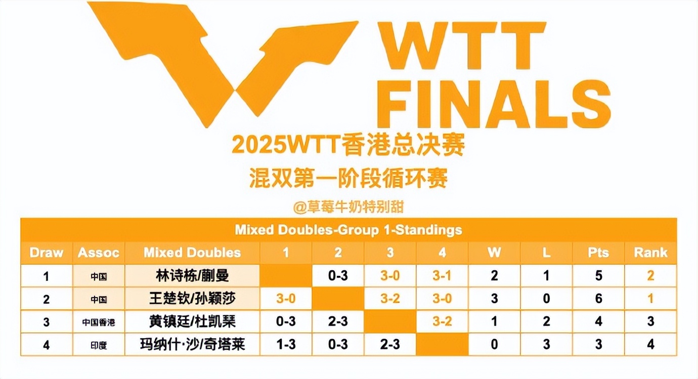 A組第一階段的比拼,王楚欽/孫穎莎三連勝小組第一晉級,林詩棟/蒯曼是2勝1負小組第二晉級。