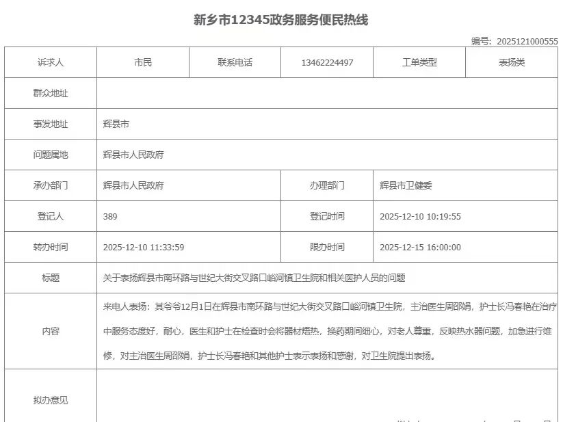 近日,輝縣市峪河鎮衛生院收到一封來自新鄉市12345政務服務便民熱線的特殊“感謝信”——患者家屬通過熱線平臺實名致謝,字里行間滿是對主治醫生周紹娟、護士馮春艷及全體護理人員的認可與感激,為凜冽冬日增添了陣陣暖意。