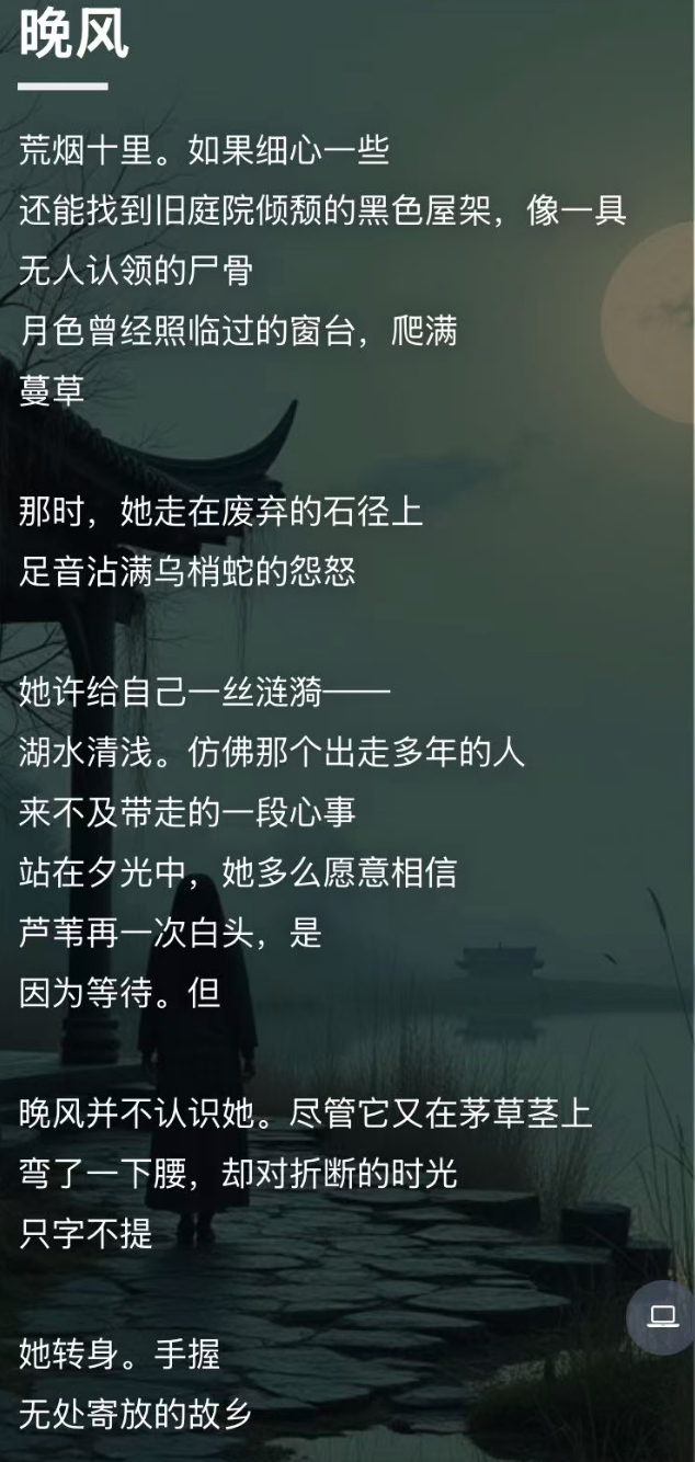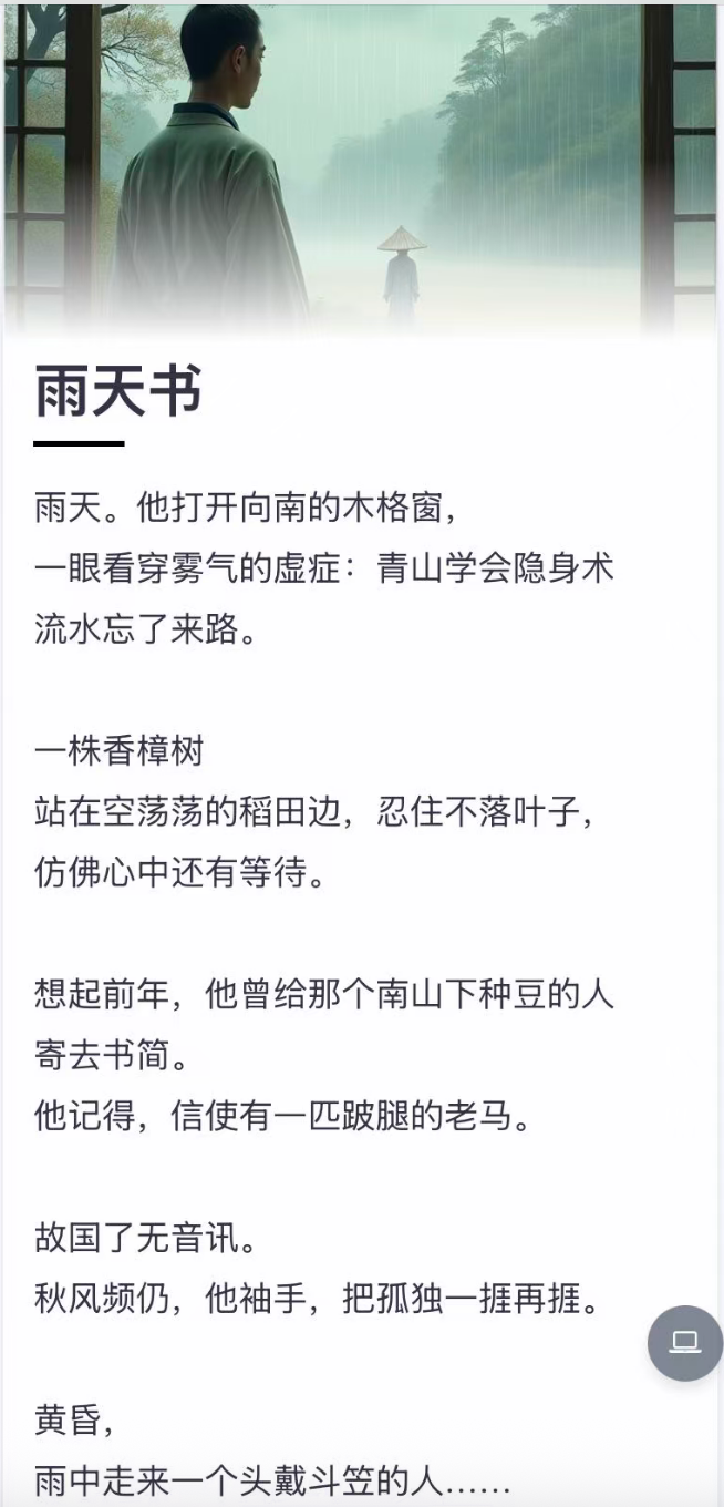 中國詩歌網最新推出“AI電子詩集”,是為詩人提供的一項詩集創作輔助工具。它借助AI大模型的強大能力,能夠精準解析詩歌中的文本內容,捕捉其中蘊含的意境、意像與情感,并將其轉換為生動逼真、富有藝術感染力的場景圖片,用以輔助詩人生成電子詩集。