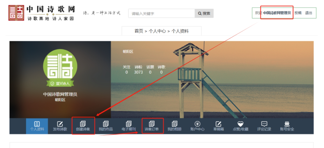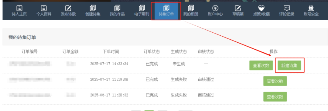 用戶可在“會員中心”—“創建詩集”菜單下單購買服務,在“詩集訂單”處新建詩集,選擇已發布的詩歌作品加入詩集。需要注意的是,詩集名稱需要審核通過后,您創建的電子詩集才會正式生成;如審核未通過,可按照提示原因進行修改。