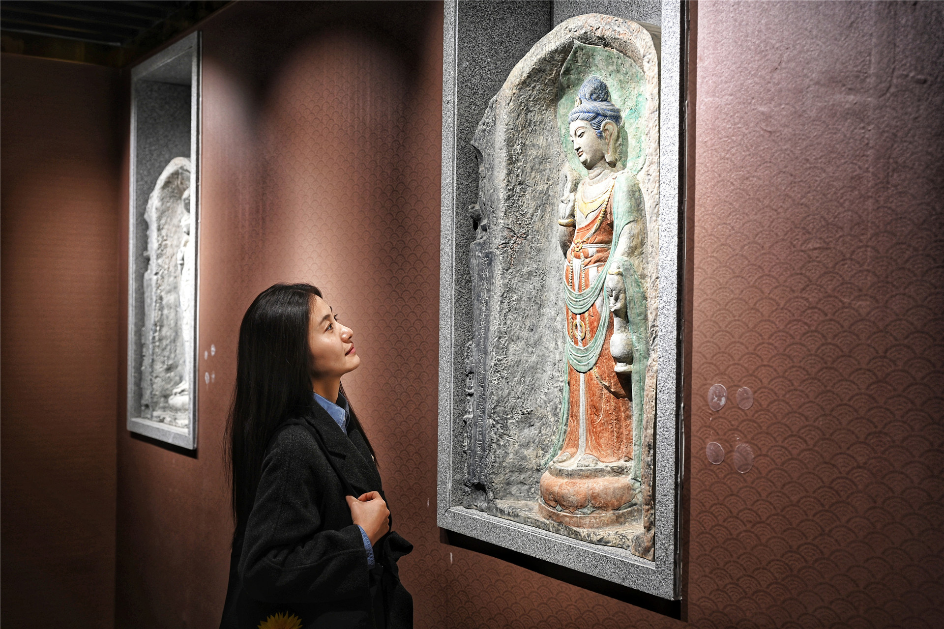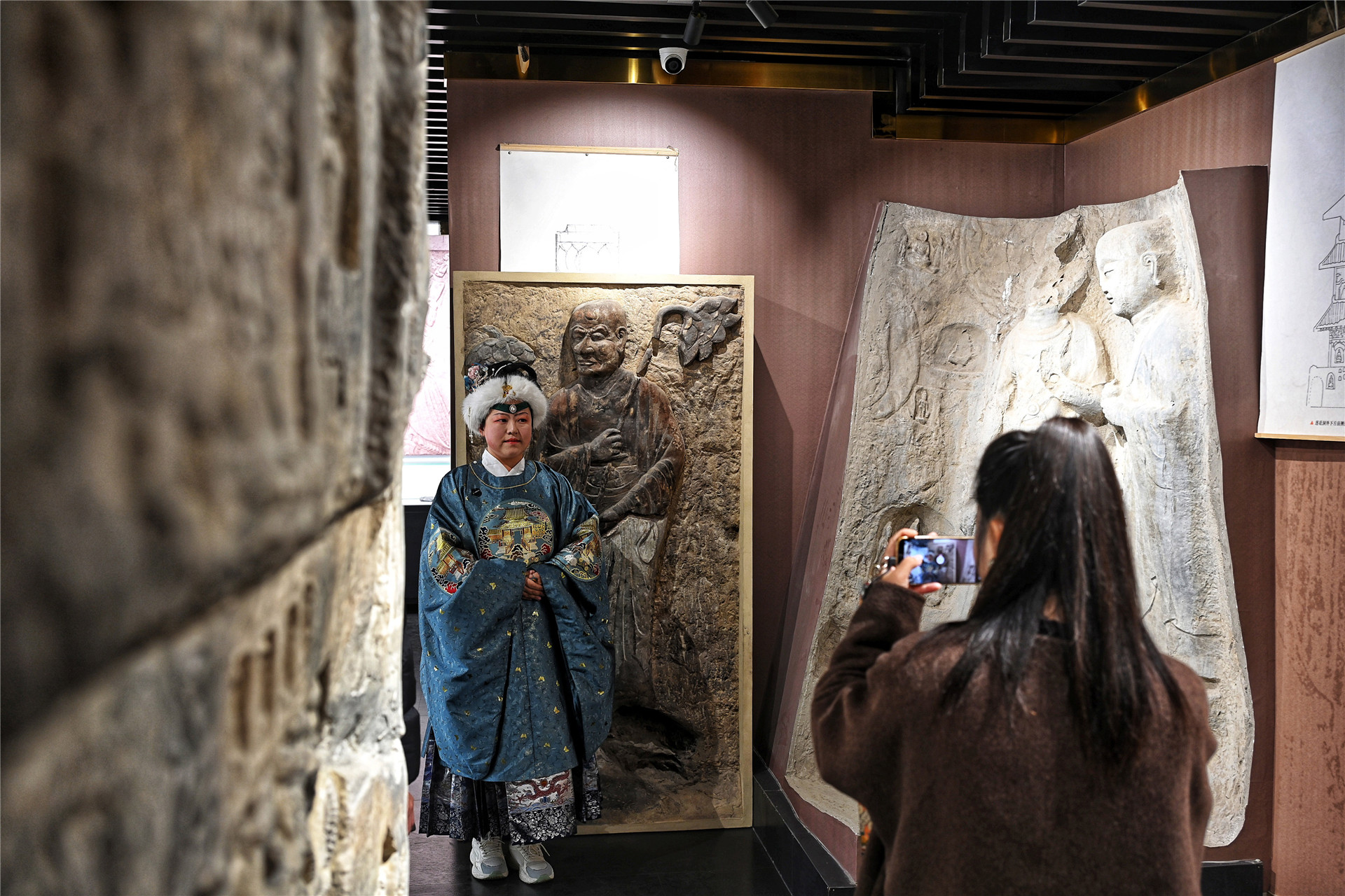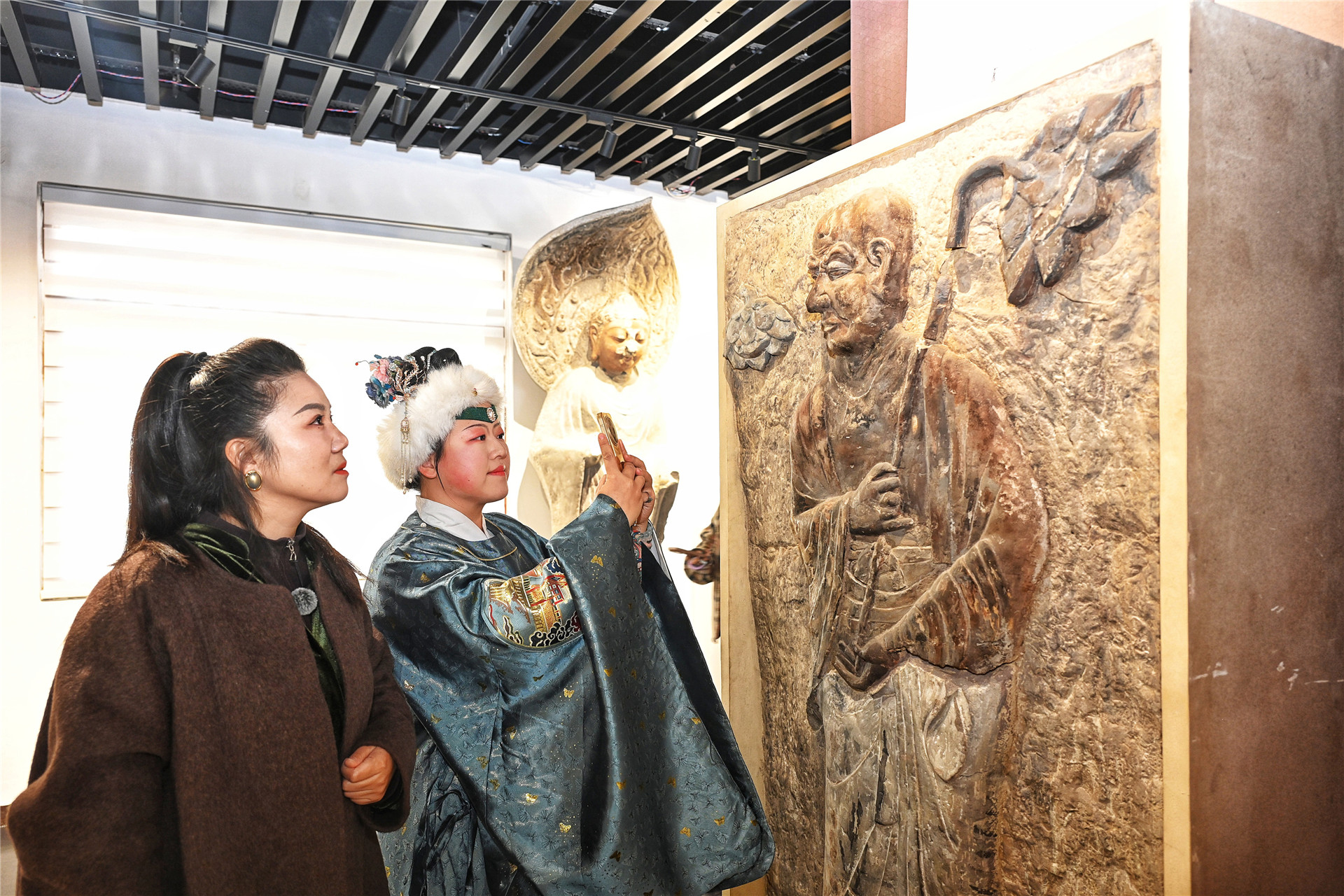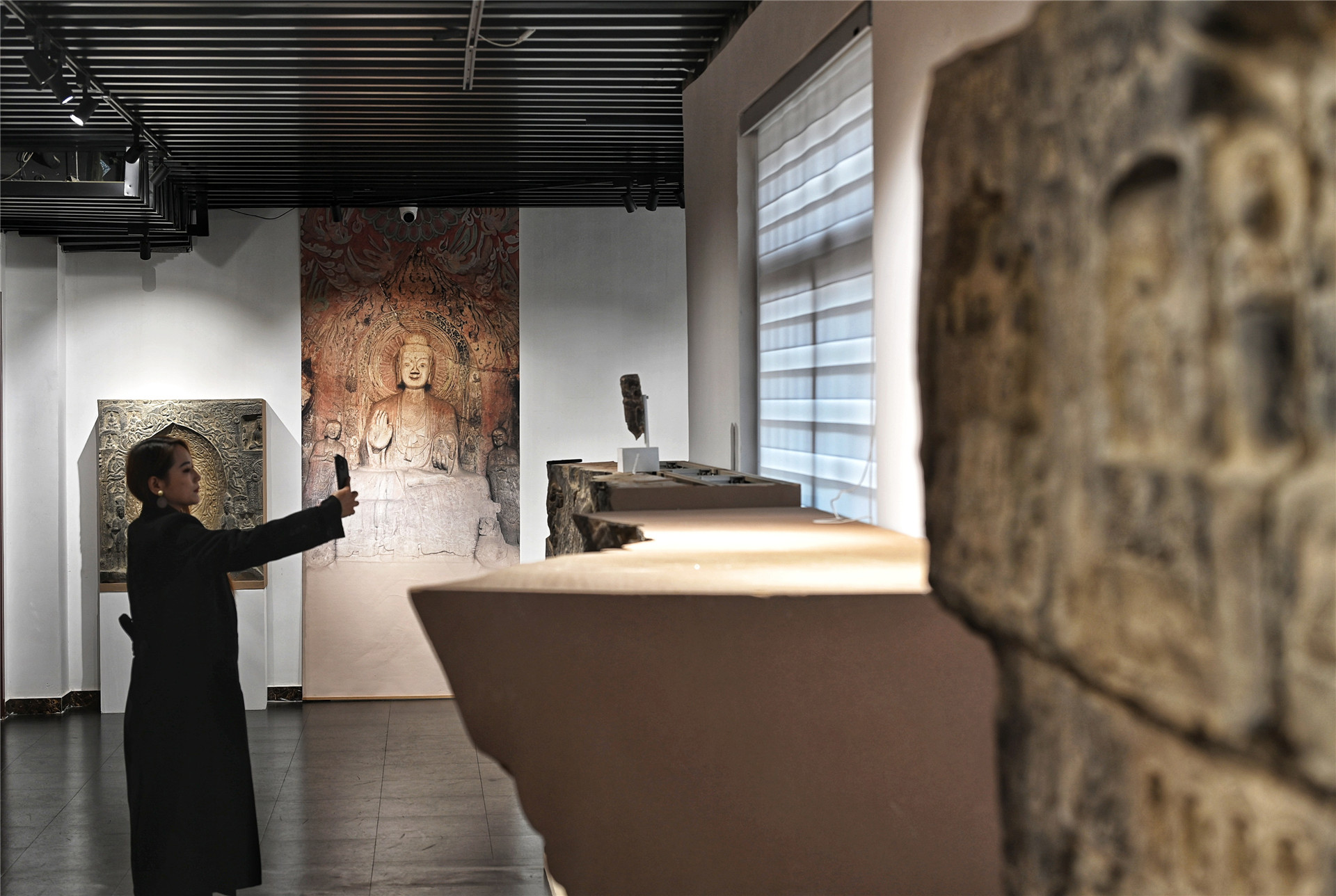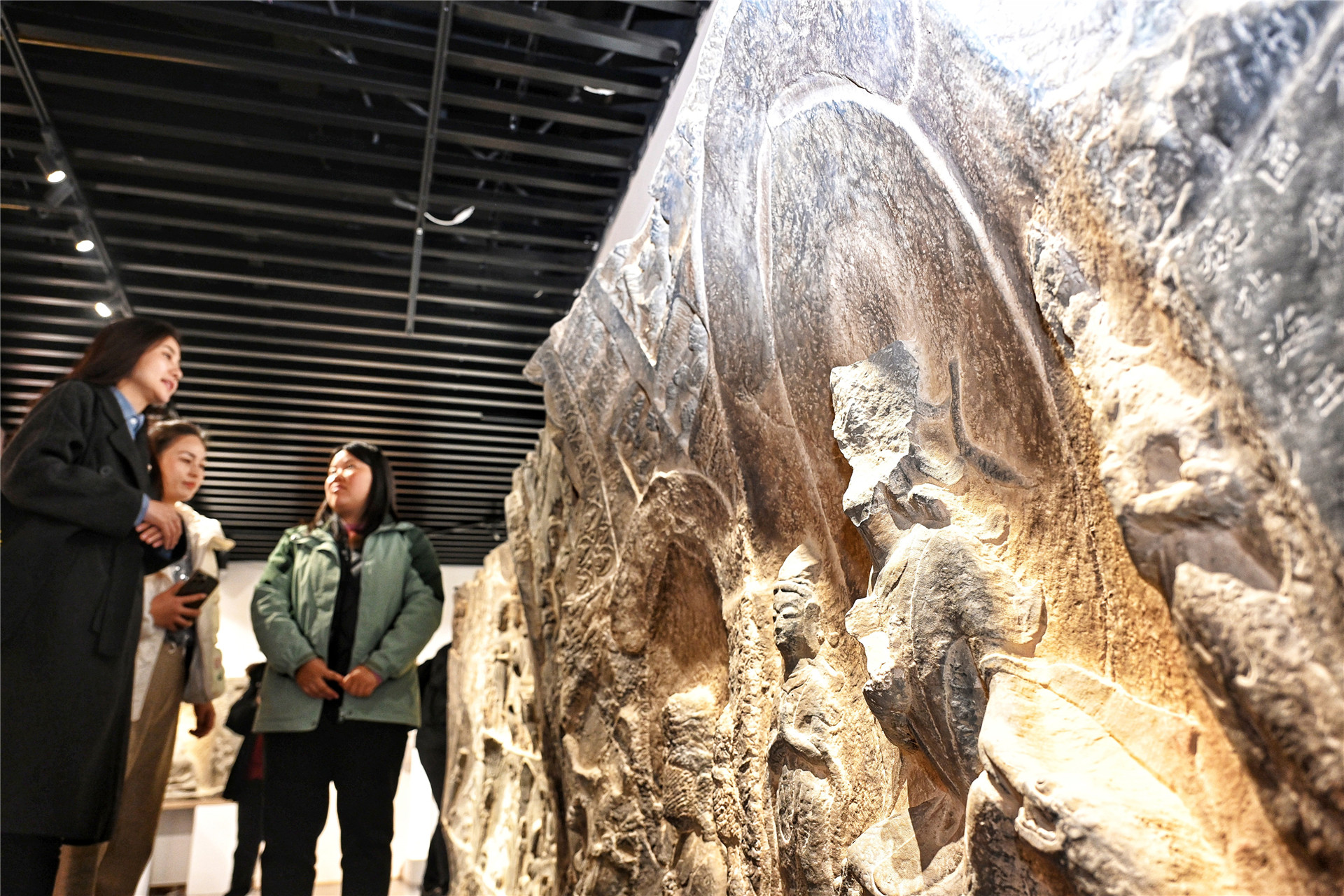 12月11日,參觀者在位于洛陽市的龍門石窟數字化展廳內參觀經過復原的數字化“文物”。