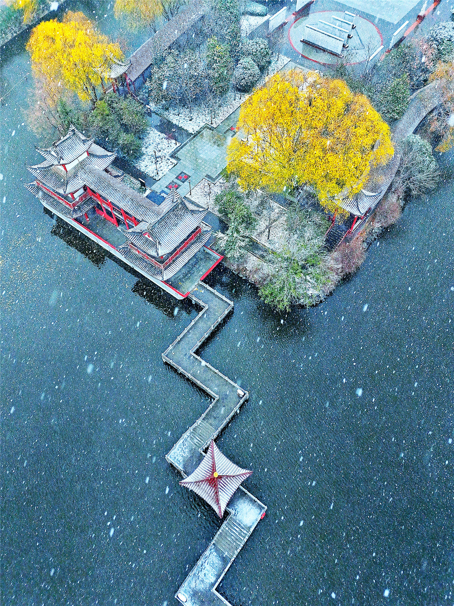 該市西湖公園瑞雪飄灑,銀裝素裹,宛如仙境,彰顯蓮城的古韻與鐘靈毓秀。(呂超峰 趙松偉 攝)