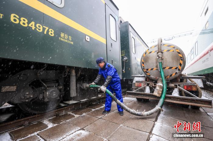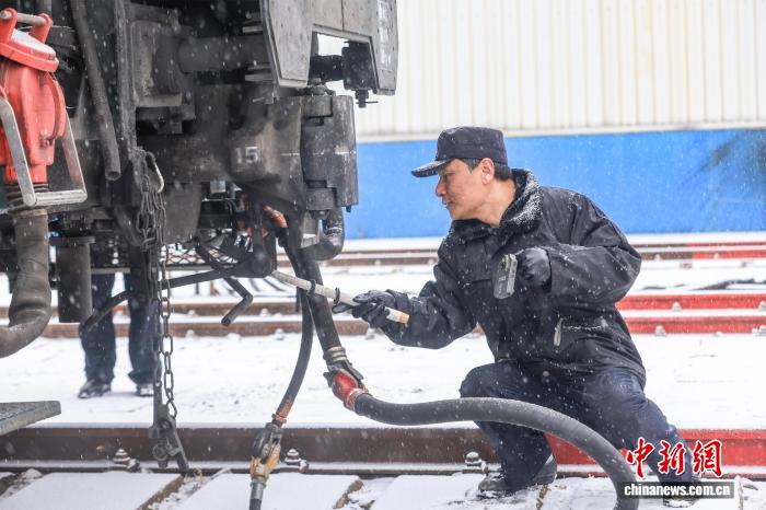 12月12日,北京市迎來2025年入冬以來首場降雪。中國鐵路北京局集團有限公司北京車輛段的作業人員冒雪進行吸污作業,確保車輛設備運行狀態良好。中新社記者 賈天勇 攝
