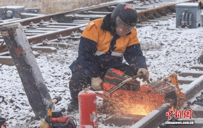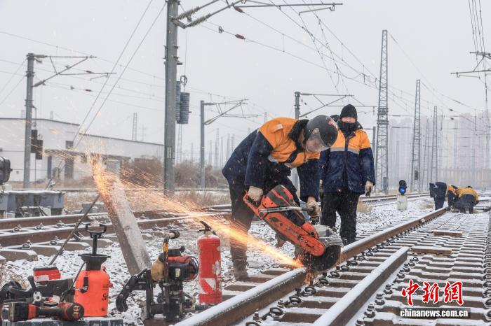 12月12日,北京市迎來2025年入冬以來首場降雪。中國鐵路北京局集團有限公司北京工務段的作業人員冒雪整修線路,確保行車安全。中新社記者 賈天勇 攝
