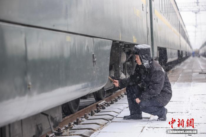 12月12日,北京市迎來2025年入冬以來首場降雪。中國鐵路北京局集團有限公司北京車輛段的作業人員冒雪檢修車輛,確保設備運行狀態良好和行車安全。中新社記者 賈天勇 攝