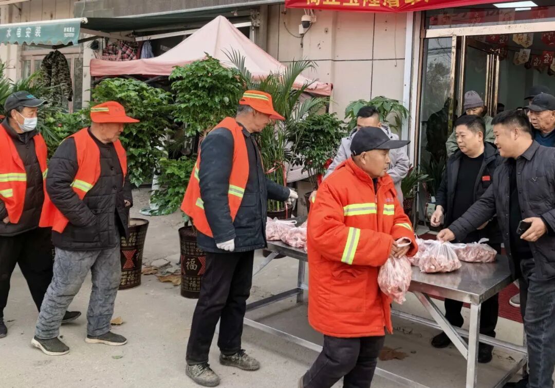 “張師傅,您拿穩(wěn)!這肉是今早剛從屠宰廠運(yùn)到的,回去燉鍋蘿卜排骨湯,暖和!”周慶新一邊遞豬肉,一邊笑著叮囑。59歲的環(huán)衛(wèi)工人張建國接過沉甸甸的肉袋,高興的說:“周老板不光人實(shí)在,對(duì)俺們環(huán)衛(wèi)工也這么上心!我們每天早起掃街,看著咱街道干干凈凈的就高興,今天還收到這么實(shí)在的禮物,心里特別高興!”