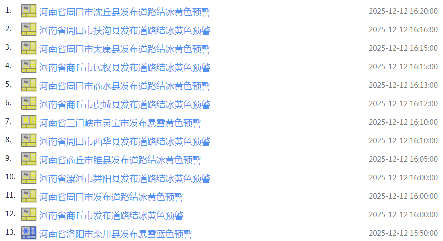 雨雪:12日5時至14時,我省北中部出現小到中雪,局部大雪,南部小雨或雨夾雪,最大降水量為沁陽二仙廟6.7毫米,最大降雪量延津5.2毫米。北中部積雪深度1到4厘米,最大積雪深度澠池4厘米。
