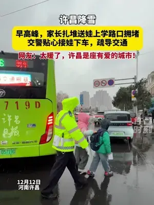 12月12日,河南許昌。許昌降雪,早高峰,家長扎堆送娃上學,路口擁堵,交警貼心接娃下車,疏導交通。網友:太暖了,許昌是座溫暖的城市!#交警 #降雪 #溫暖有愛 #河南天氣 (記者:譚宜姝;編輯:朱琳)