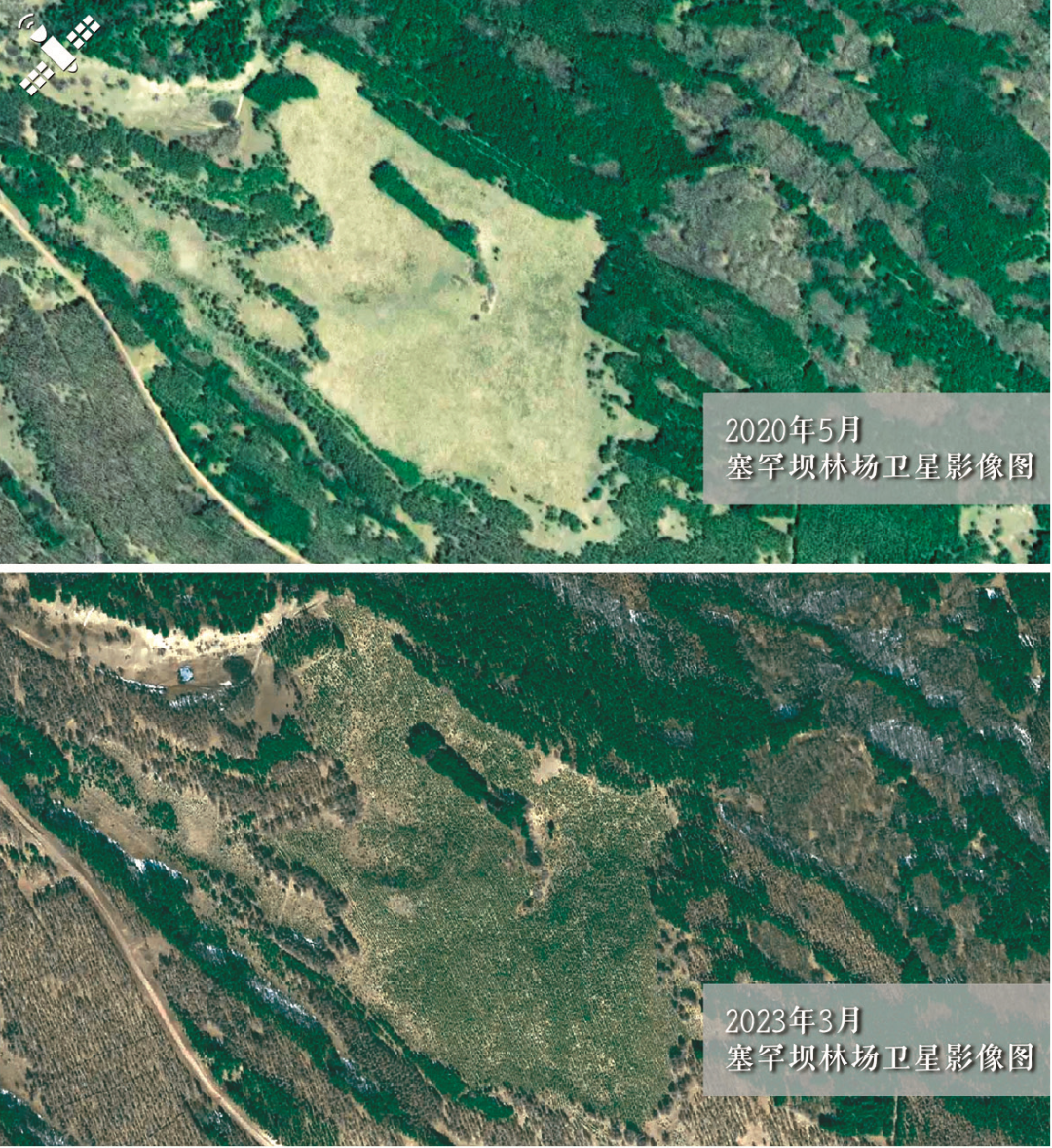 □ 塞罕壩林場衛星對比圖:2023年與2020年相比,塞罕壩林場內的森林覆蓋面積持續提升