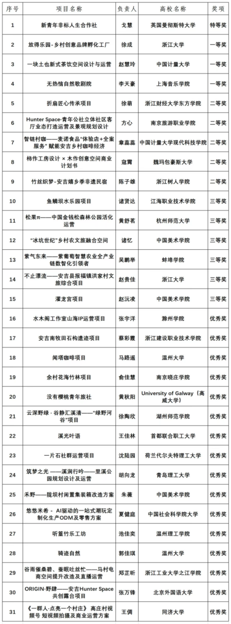第三屆“兩山杯”全國大學(xué)生鄉(xiāng)村振興創(chuàng)新創(chuàng)意創(chuàng)業(yè)大賽創(chuàng)業(yè)賽道獲獎名單