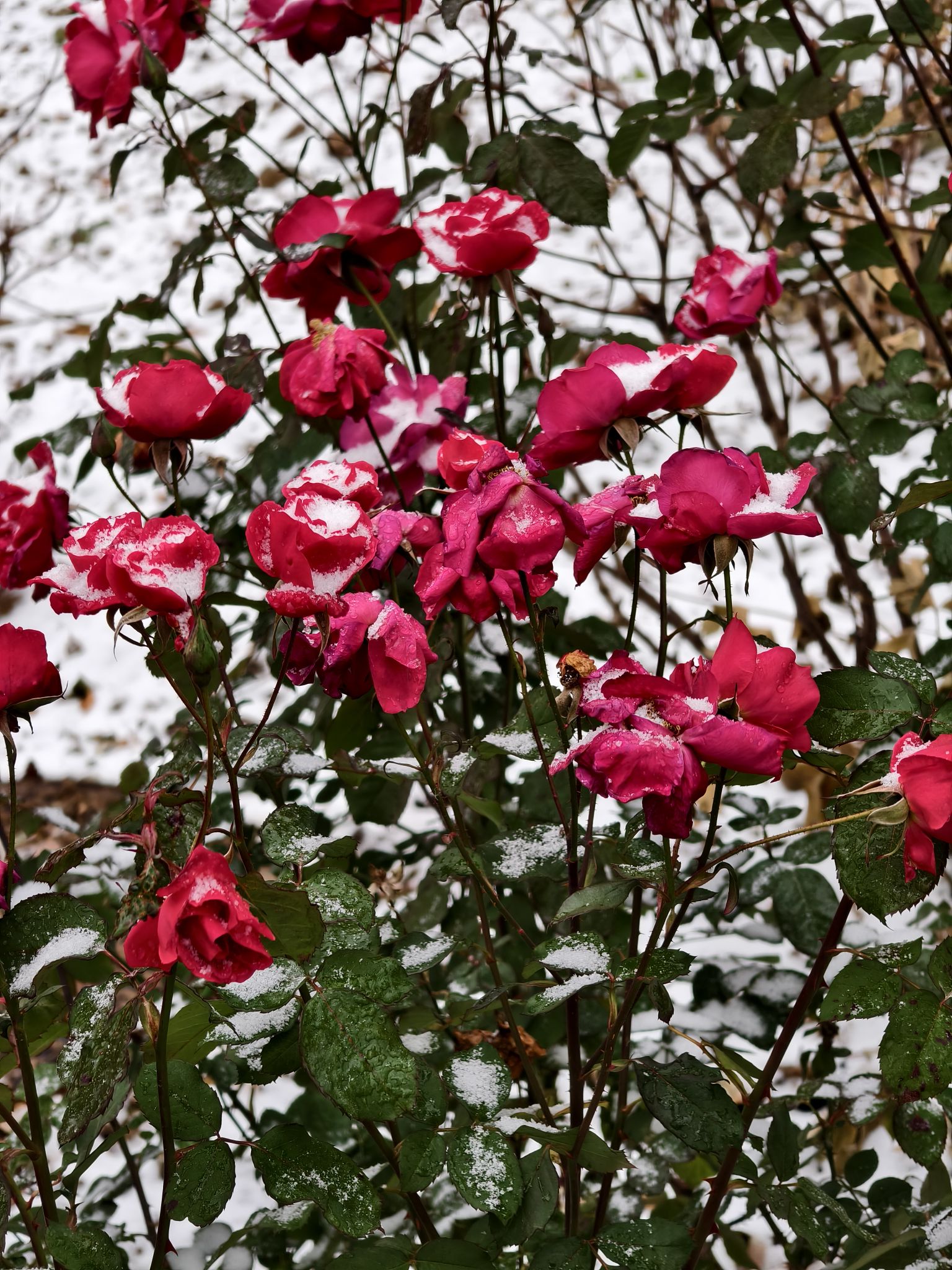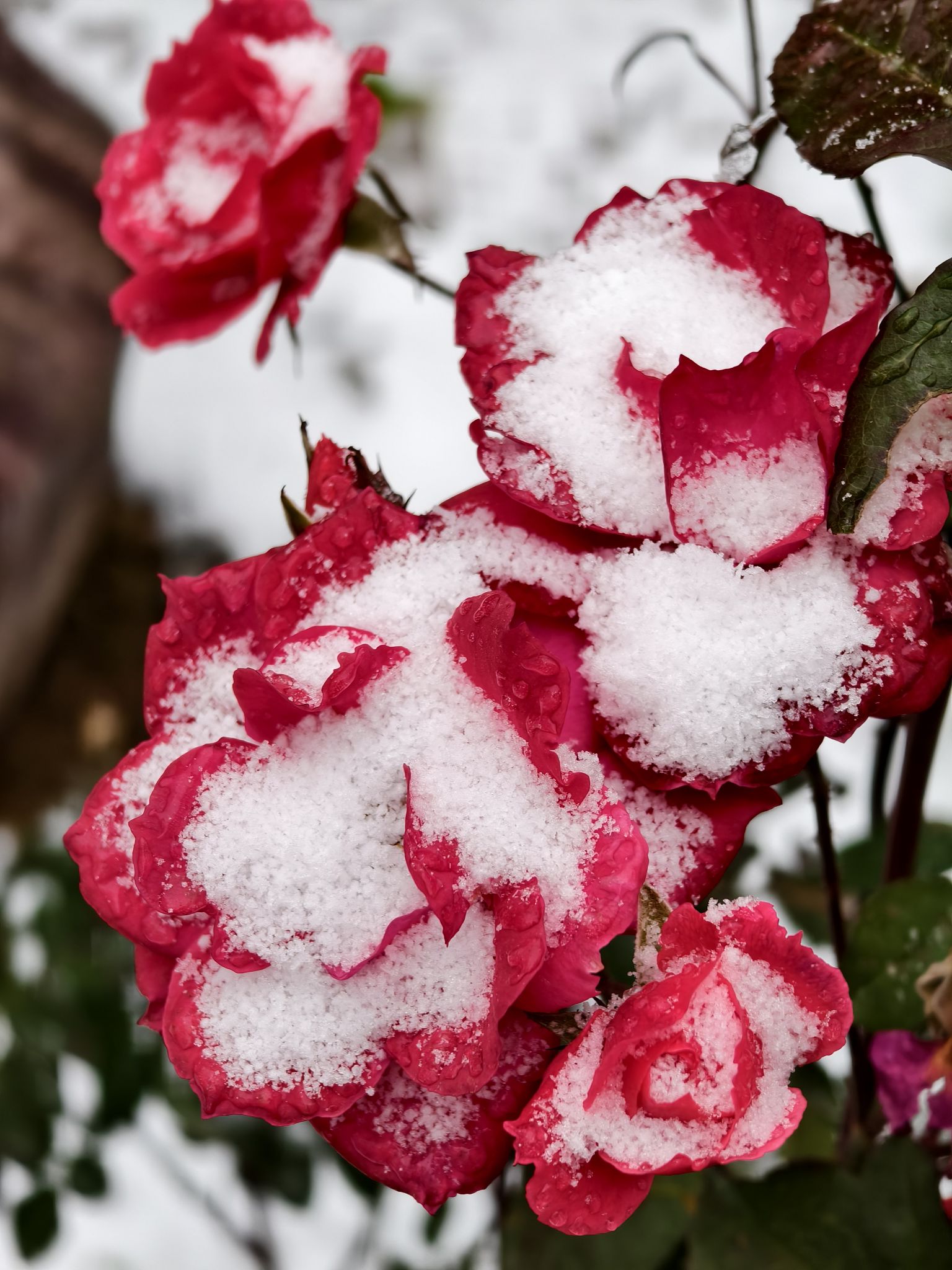 園中的紅月季是最惹眼的,層層花瓣如絲絨般艷麗,白雪堆積在花心,像是紅燭上凝的蠟,又似少女頰邊的霜。它們不像梅花那般以耐寒著稱(chēng),卻在初雪的寒意里,依舊保持著盛放的姿態(tài)。有的花骨朵剛綻了半分,雪粒沾在嫩瓣上,像綴了顆顆碎鉆;有的已然盛放許久,花瓣邊緣微微蜷曲,卻依舊不肯垂落,頂著雪團(tuán)倔強(qiáng)地立著。枝干上的刺還帶著綠意,牢牢支撐著覆雪的花朵,像是守護(hù)著一場(chǎng)不肯落幕的浪漫。