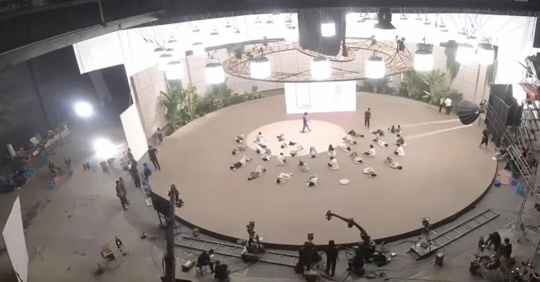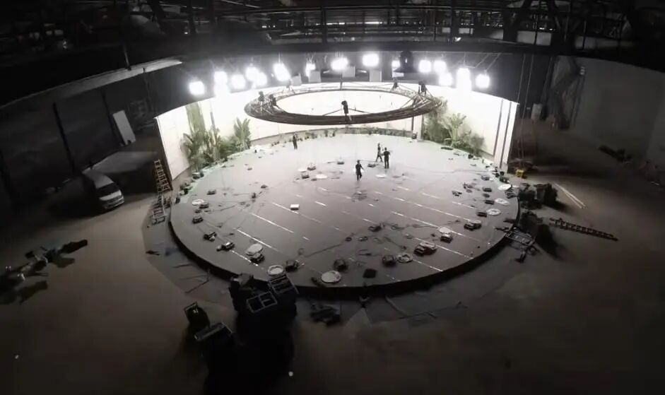 最終,葉洪新敲定主場景墻面以清水混凝土板為主并輔以漸綠植元素點綴,整體為圓形帶鏤空環形穹頂的自然輕工業風格場景。