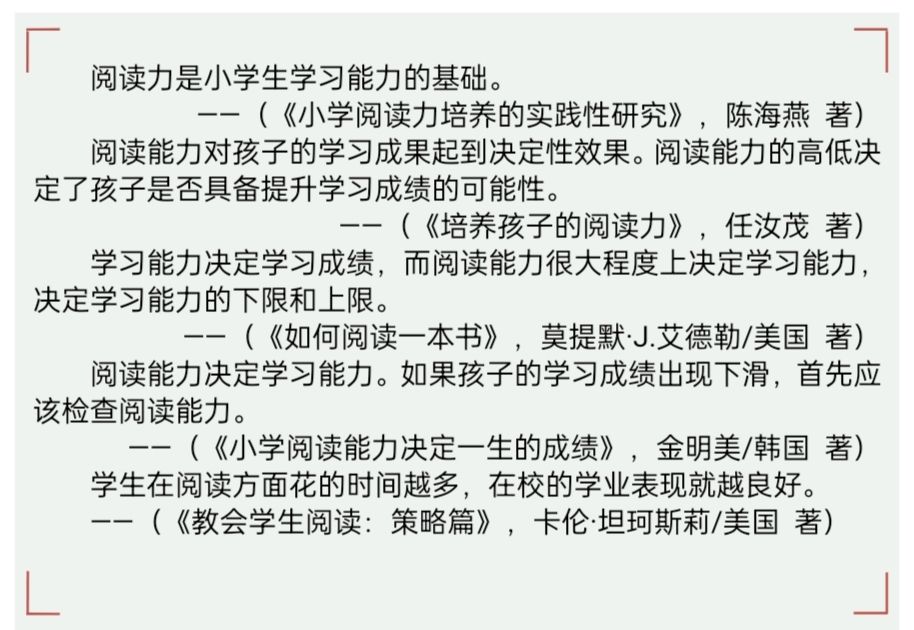 除此之外,前蘇聯教育家瓦·阿·蘇霍姆林斯基、北大教授溫儒敏、特級教師于永正等也表達過相似的觀點,他們認為,“閱讀能力是學生的首要能力,學生能否順利地進行學習,首先取決于他會不會有理解地閱讀”,“沒有閱讀能力的孩子,升學要吃大虧”,“閱讀力強的學生,學習能力也一定強”。另據調查研究顯示,學習成績居年級5%的學生,其閱讀能力一般要高于自身年級1年以上,80%學習成績不優的學生都表現出閱讀能力不佳。由此可見,無論是閱讀力還是閱讀能力,其對學習能力、學習效果、學習成績的影響是顯而易見的。