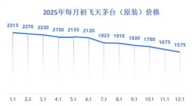 回顧2025年以來的市場走勢,飛天茅臺零售價格呈現出單邊下行態勢。6月11日散瓶批發價首次跌破2000元心理關口后,降價通道正式開啟:6月22日跌至1900元以下,6月25日再破1800元,雖7月7日短暫反彈至1880元,但8月29日再度失守1800元,10月底跌破1700元,11月末跌破1600元,直到12月12日打破官方指導價。
