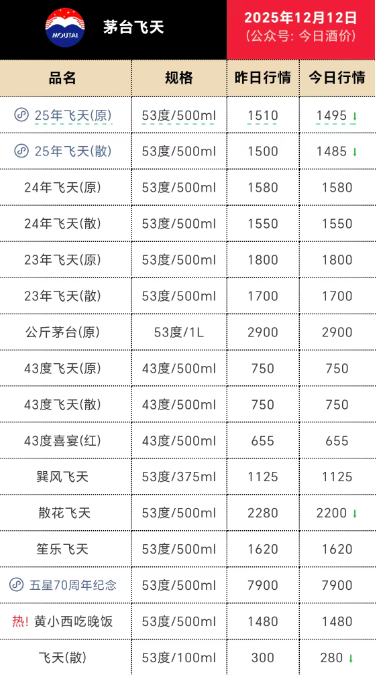 12月12日,濟南迎來今冬第一場降雪。然而,白酒經銷商們卻無心欣賞雪景,面對當天的市場報價,心里早已“涼透了心”。第三方平臺“今日酒價”數據顯示,12月12日,53度500ml飛天茅臺散瓶批發參考價已跌至1485元/瓶,原箱產品報價為1495元,均較前一日下跌15元,且散瓶批價已跌破1499元的官方指導價。受此影響,經銷商目前每賣出一瓶飛天茅臺大約虧損100元。