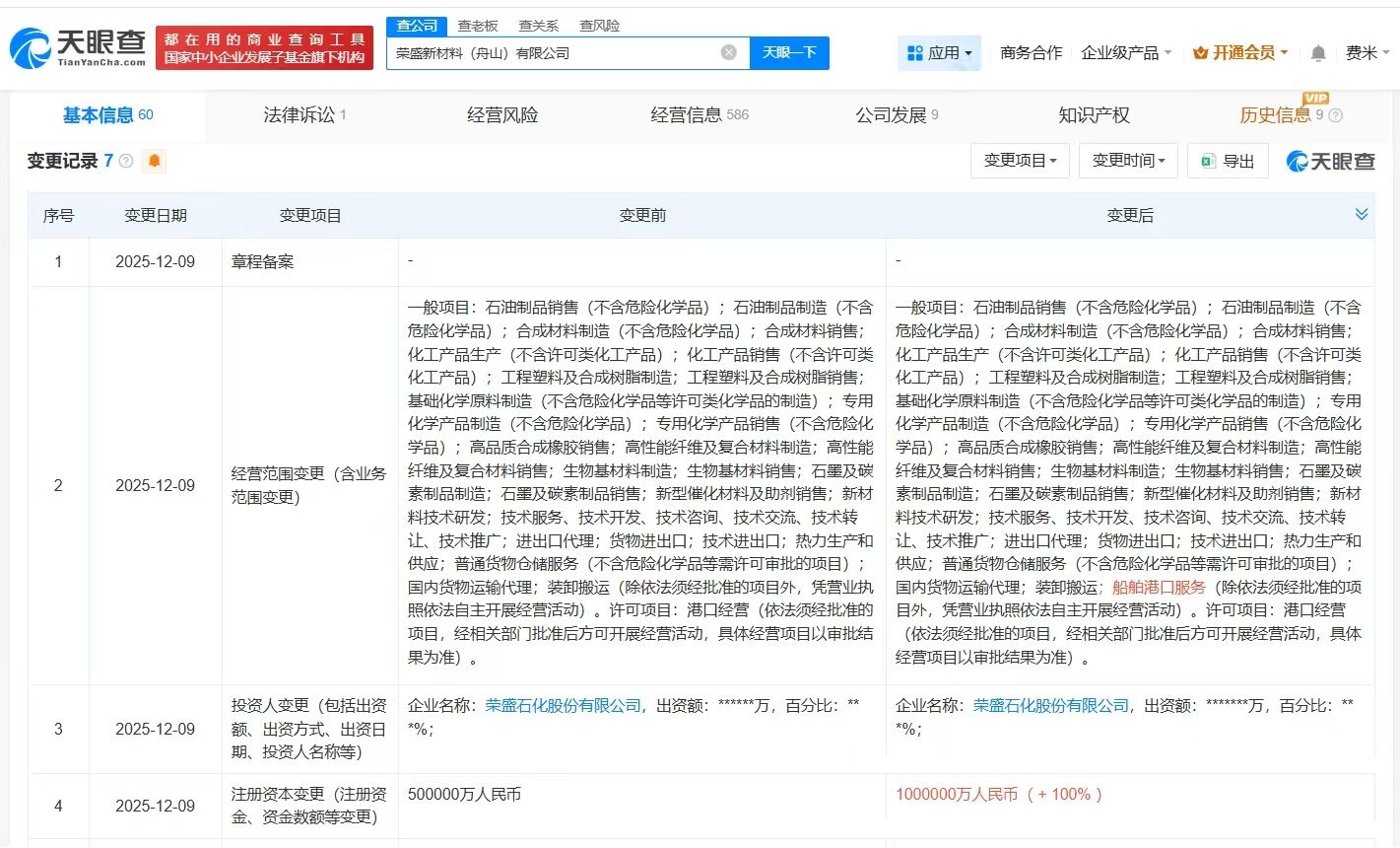 天眼查App顯示,近日,榮盛新材料(舟山)有限公司發生工商變更,注冊資本由50億人民幣增至100億人民幣,增幅100%。