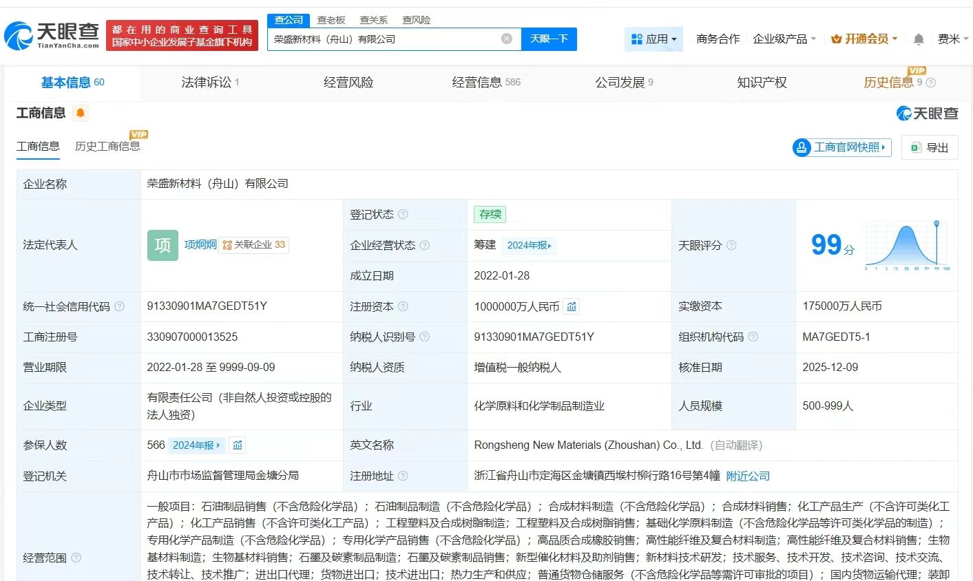 該公司成立于2022年1月,法定代表人為項炯炯,經營范圍包括石油制品銷售、石油制品制造、合成材料制造等,由榮盛石化(002493)全資持股。