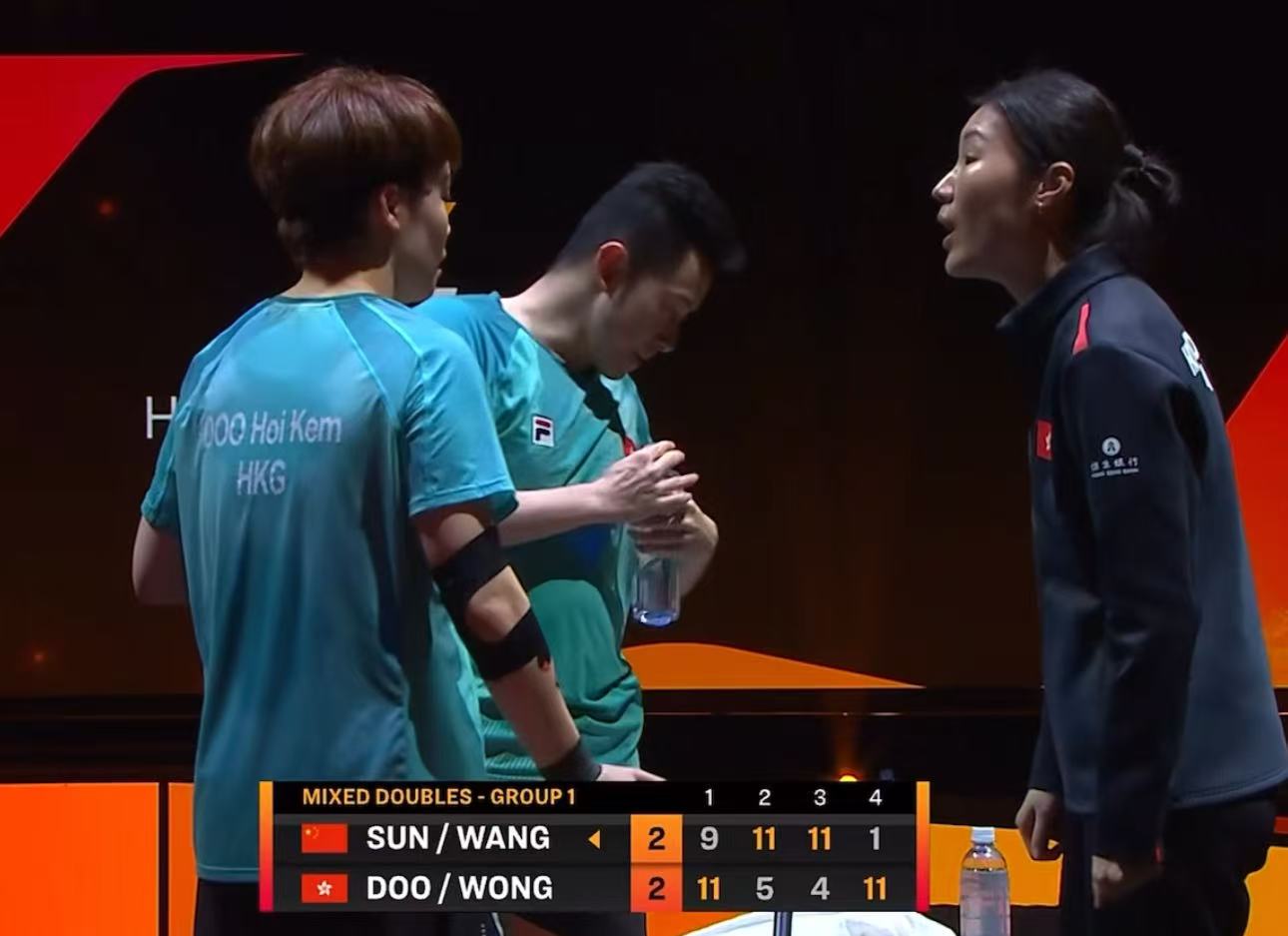 在12月12日晚間進行的混雙小組賽第3輪中,此前2戰全勝的國乒組合王楚欽/孫穎莎(首戰3-0瑪納什-沙/奇塔萊;第二戰3-0林詩棟/蒯曼),對陣中國香港組合黃鎮廷/杜凱琹,這場比賽雙方爭奪得相當激烈,中國香港組合黃鎮廷/杜凱琹在第4局更是轟出了11-1的懸殊比分。