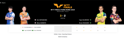 巴西組合雨果/高橋-布魯娜4-1取得領先,中段日本組合松島輝空/張本美和追至3-5,巴西組合強勢連得3分,8-3領先將比分拉開。局末階段,巴西組合10-4拿到6個局點,日本組合挽救一個局點,雨果/高橋-布魯娜11-5又贏下第三局,大比分2-1反超了日本組合。