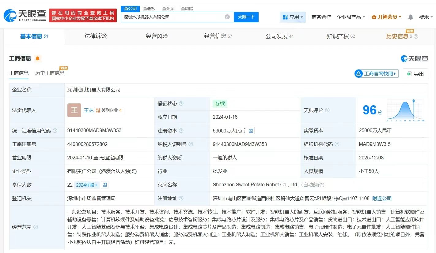該公司成立于2024年1月,法定代表人為王叢,注冊資本6.3億人民幣,由D-Robotics Holding Limited全資持股。