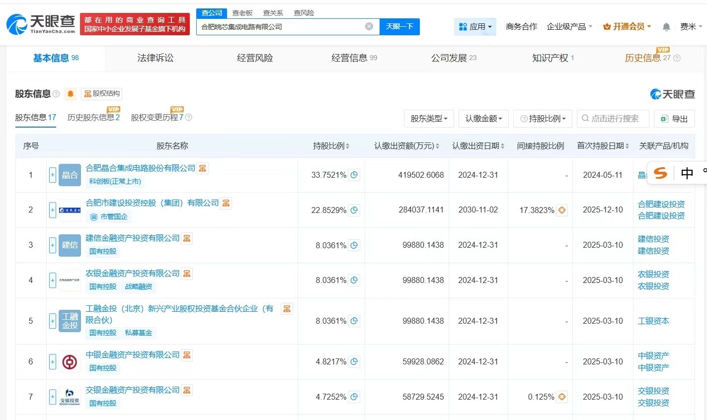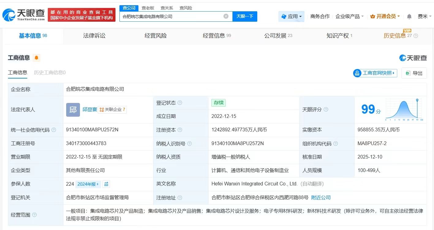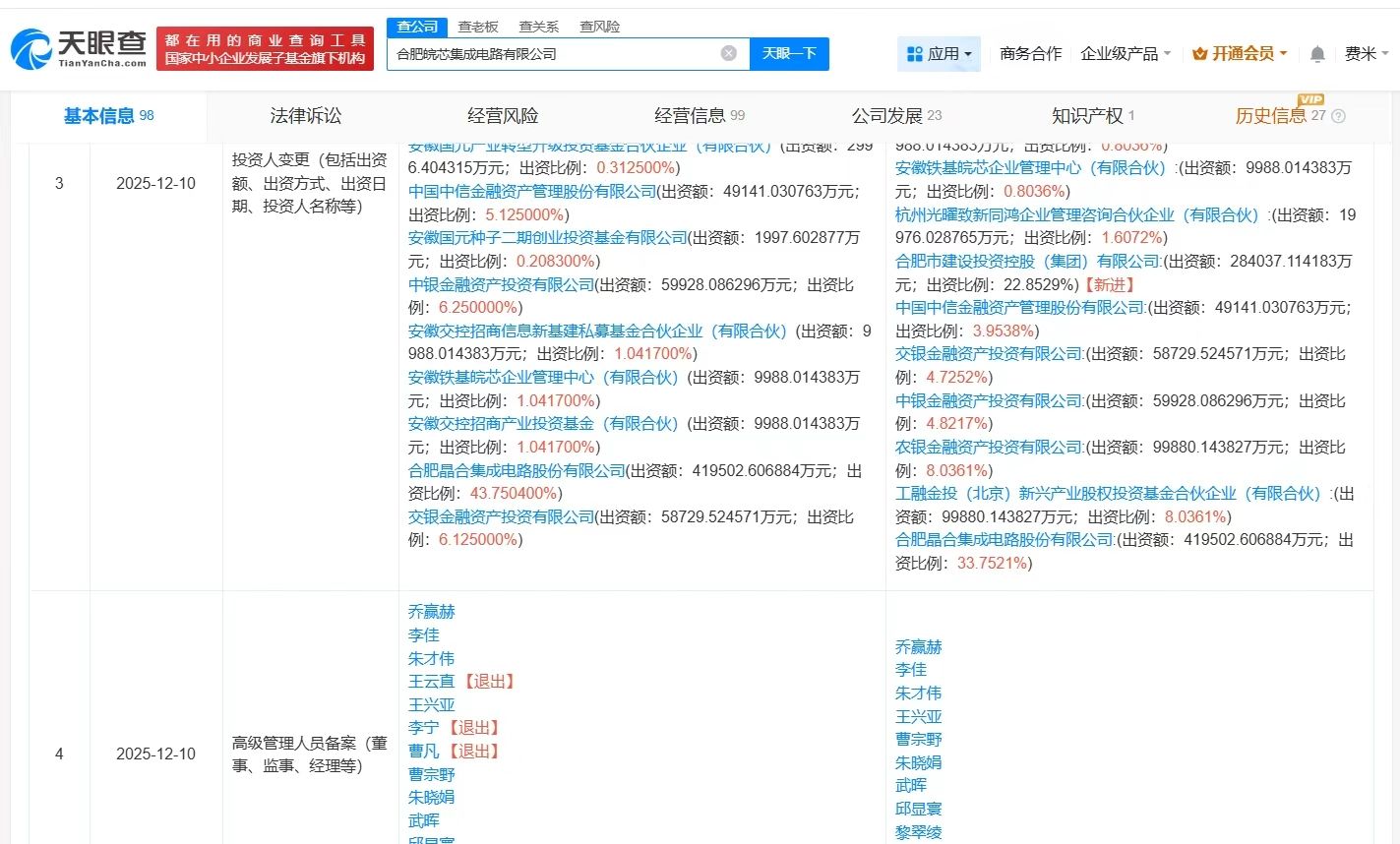 天眼查App顯示,近日,合肥皖芯集成電路有限公司發(fā)生工商變更,新增合肥市建設(shè)投資控股(集團(tuán))有限公司為股東,同時,注冊資本由約95.89億人民幣增至約124.3億人民幣,增幅約30%,同時,部分高管發(fā)生變更。