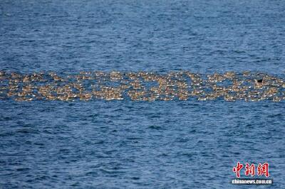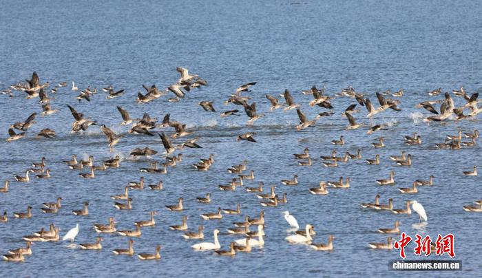 中新網江西彭澤12月12日電 (付麗玲 柯恒 趙斌)連日來,隨著寒潮南下,大批候鳥陸續飛抵鄱陽湖周邊的江西九江市彭澤縣太泊湖水域越冬。湖面上,白鶴、小天鵝、鴻雁、豆雁等候鳥或翩躚起舞,或低頭覓食,與波光粼粼的濕地構成一幅生機盎然的冬日畫卷。