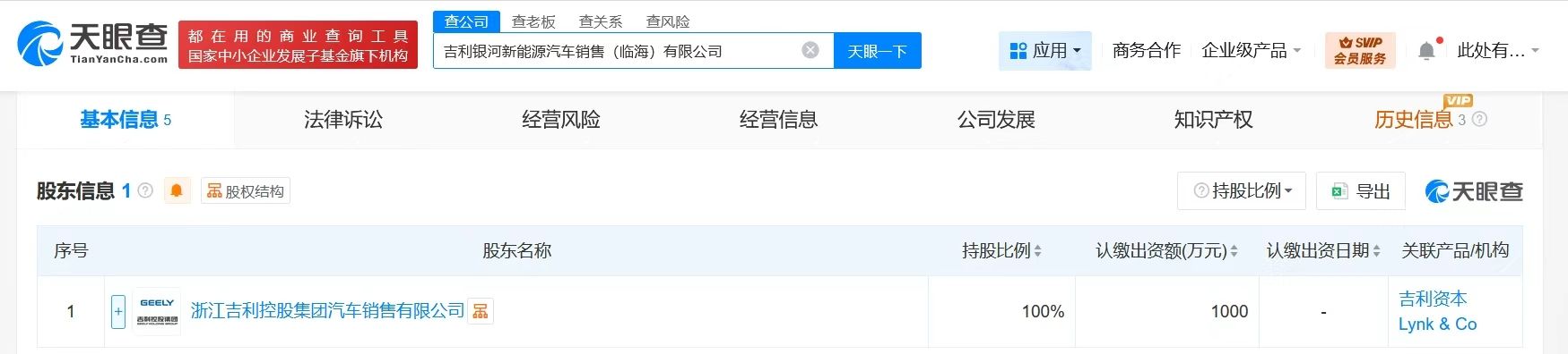 天眼查App顯示,近日,吉利銀河新能源汽車銷售(臨海)有限公司成立,法定代表人為婁源發,注冊資本1000萬人民幣,經營范圍含新能源汽車整車銷售、汽車零部件及配件制造、汽車零配件批發、汽車銷售、汽車零配件零售、貨物進出口、普通貨物倉儲服務、汽車零部件研發等。股東信息顯示,該公司由浙江吉利控股集團汽車銷售有限公司全資持股。
