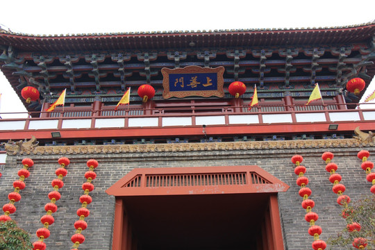- 上善門:在宋代是出入開封的重要通道,是城內和城外的分界線。城樓正脊21.6米,建筑面積1553平方米,門洞高8米,寬6.5米,紅墻綠瓦,飛檐斗拱,十分壯觀。?