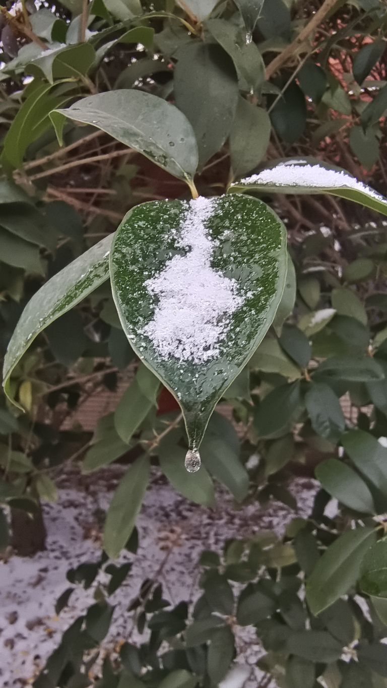 俯身細看,葉片上的雪花晶瑩剔透,將綠葉襯托得愈發蒼翠欲滴。有的雪花還在葉面上滾動,像是調皮的小精靈,不肯安分地停留。伸手拂過葉片,雪粒簌簌滑落,留下幾滴晶瑩的水珠,順著葉脈緩緩流淌。這白綠交映的冬青,像是冬日里的一抹倔強,用生機與活力,對抗著嚴寒的侵襲,也給這座城市的初雪,增添了一抹別樣的色彩。