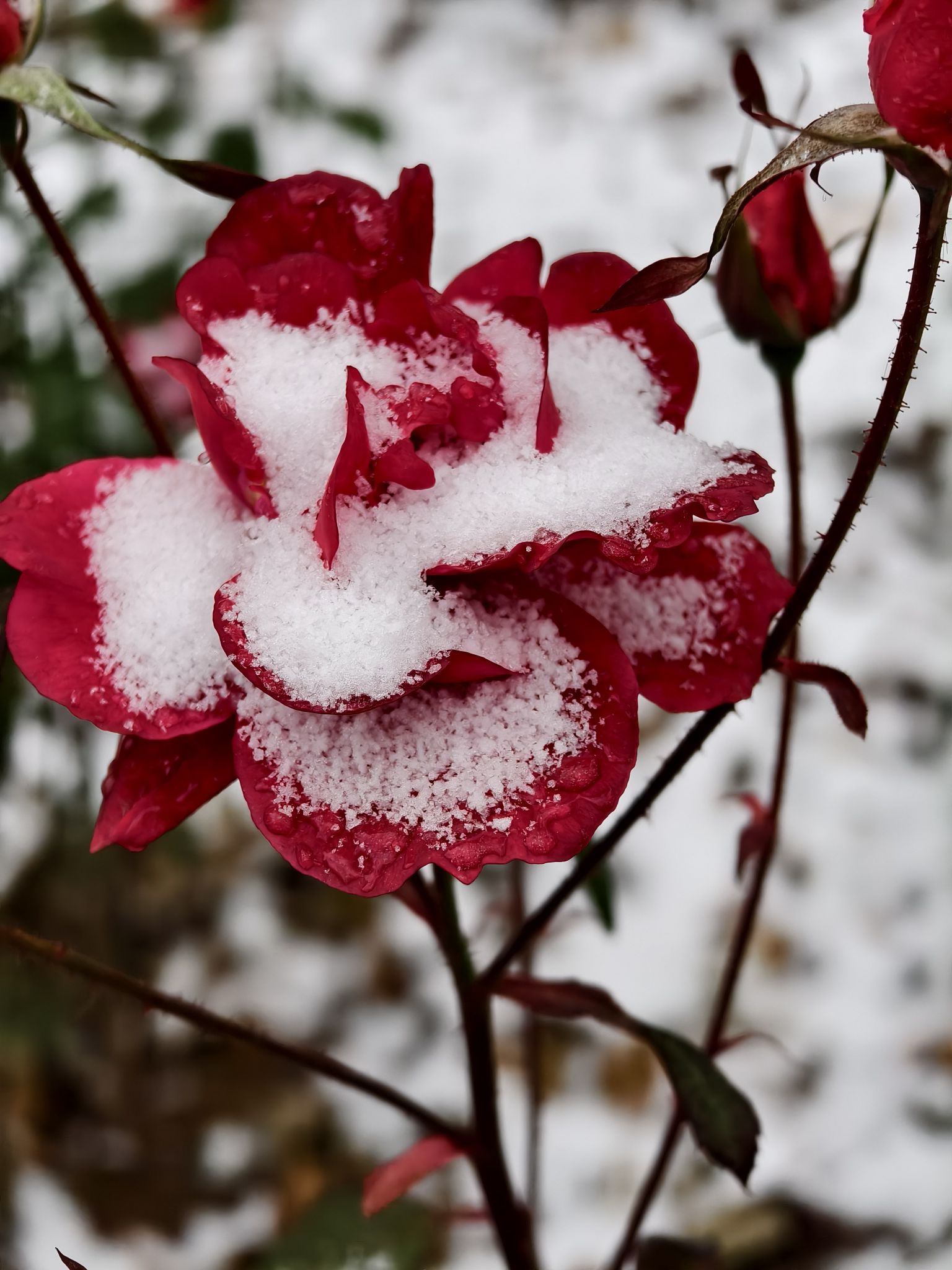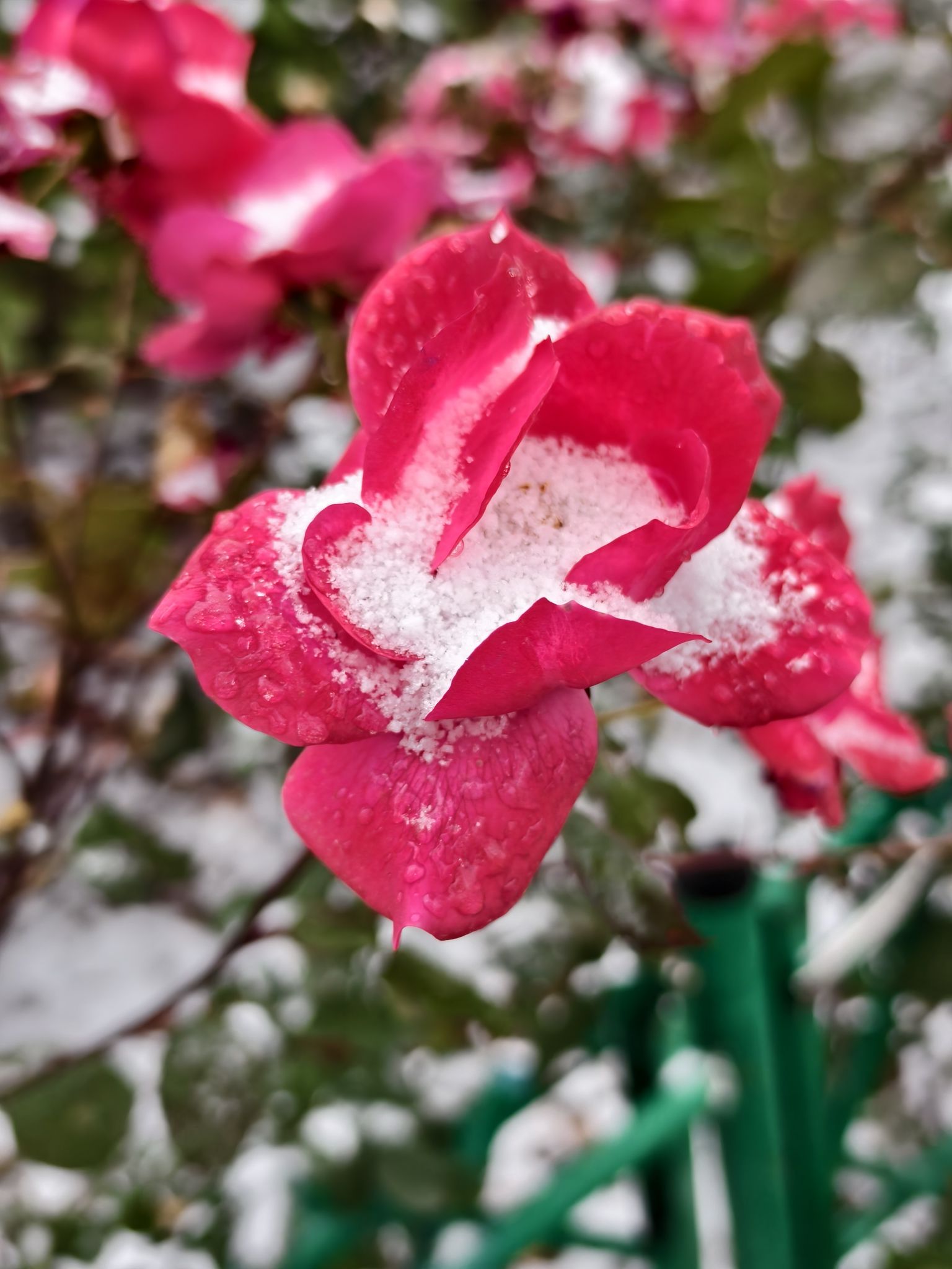 湊近了看,雪花還在慢悠悠地飄落,一片、兩片,落在花瓣的褶皺里,堆積出小小的雪丘。微風拂過,花枝輕輕搖曳,雪粒簌簌落下,帶著幾分俏皮。伸手觸碰,花瓣柔軟依舊,雪花冰涼沁人,兩種截然不同的觸感交織在一起,竟生出一種奇妙的愜意。這雪落月季的景致,沒有冬日的蕭瑟,反倒是多了幾分春日的柔情,讓人沉醉其中,流連忘返。