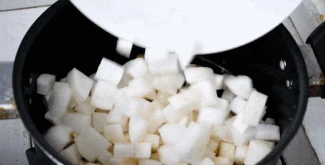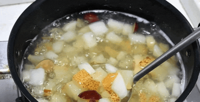 蓋蓋大火燒開,撇去表面浮沫(去雜質,湯更清亮),放入老冰糖攪勻融化。轉小火煮20分鐘(別開蓋,燜出營養)。用筷子戳蘿卜塊,能輕松戳透就煮好了,梨塊也會變軟透亮。