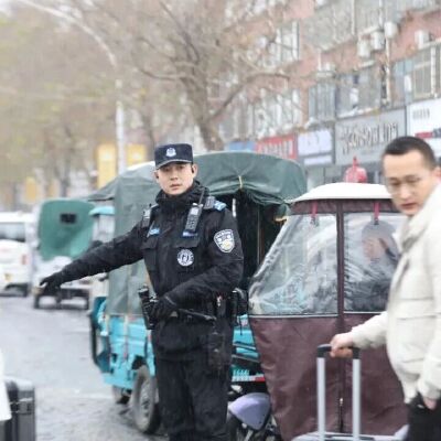 作為交通保障“主力軍”,沁陽市公安局交通管理大隊凌晨5點便啟動應急預案,全體民警、輔警頂風冒雪堅守崗位。在汽車站路口等重點區域,執勤交警在風雪中筆直站立,有條不紊地疏導車流;針對主要路口、易結冰路段及坡道橋梁,通過增派警力、定點執勤與流動巡邏相結合的方式強化管控,僅汽車站路口執勤崗就增加3名警力。