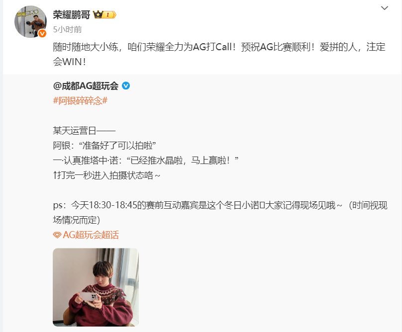 而很快榮耀中國區電商部部長 @榮耀鵬哥 轉發了一條AG電競俱樂部發布的隊員一諾的日常花絮更是被認為是在暗示,這就是榮耀WIN系列的真機諜照。根據 @成都AG超玩會 發布的微博顯示,這是記錄了一諾手持神秘新機全神貫注游戲的畫面,并配文“已經推水晶啦,馬上贏啦”。將圖片放大之后可以看到,一諾手中使用的正是“榮耀WIN”系列新機,而這也被認為是該系列新機的首次曝光。