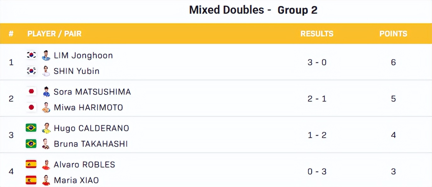 隨著日本隊3比2涉險過關,混雙四強落位,半決賽對陣如下圖所示。
