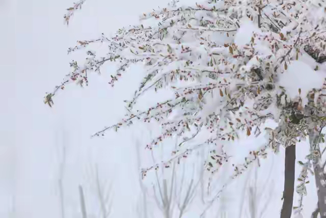 天地間漸漸染上統一的色調,卻不顯單調。遠處的樓宇籠罩在朦朧雪霧中,輪廓變得柔和;路邊的灌木叢裹著蓬松的雪衣,像一個個憨態可掬的雪人;枝頭殘留的紅果覆著白雪,紅白相映,格外醒目。最動人的是街燈旁的景致,暖黃的光暈將雪花染成溫柔的金色,它們在光中翩躚起舞,仿佛無數螢火蟲穿梭,為清冷的清晨添了幾分暖意。行人放慢了腳步,有人抬手接住雪花,看它在掌心緩緩融化,有人舉起手機,定格這轉瞬即逝的美好,連匆匆趕路的人,也忍不住抬頭望一眼這潔白的天地,嘴角漾起淺淺的笑意。