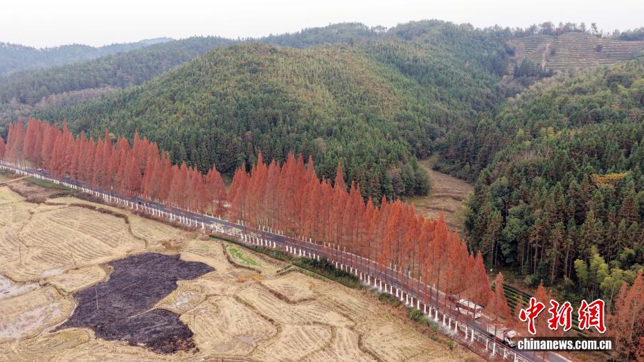 12月12日,武夷山國家公園1號風(fēng)景道福建省南平建陽區(qū)麻沙鎮(zhèn)江星公路進入最佳觀賞期。20公里水杉盡染紅棕,與黛色青山、淡黃色收割后的稻田相映如油畫。游客自駕打卡,美景刷屏社交平臺,這條路也成閩北冬日生態(tài)名片。圖為紅杉俯拍。(無人機拍攝)