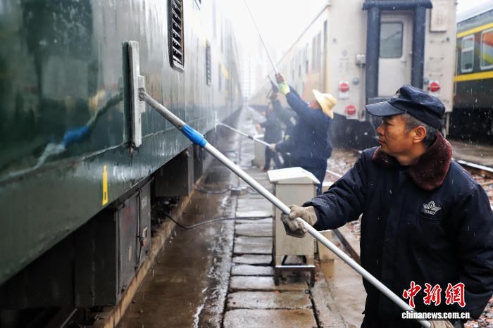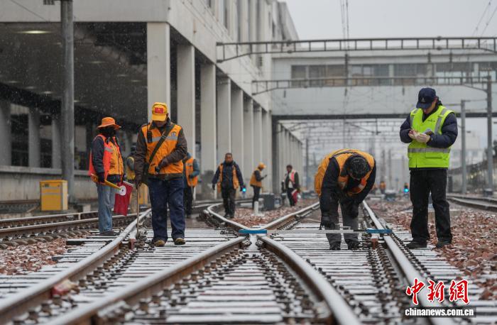 12月12日,國鐵集團鄭州局管內迎來今年首場大范圍降雪。鄭州局工作人員在雪中對鐵路線進行清掃和防護,并通過科技手段實時監測線路狀況,快速清除積雪,確保列車安全平穩運行。圖為工作人員雪天為鐵路護航。 國鐵集團鄭州局 供圖