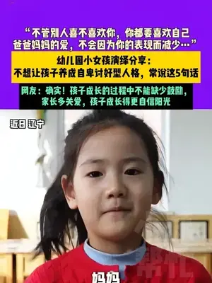 近日 遼寧,“不管別人喜不喜歡你,你都要喜歡自己,爸爸媽媽的愛,不會因為你的表現而減少…”幼兒園小女孩演繹分享:不想讓孩子養成自卑討好型人格,常說這5句話,網友:確實!孩子成長的過程中不能缺少鼓勵,家長多關愛,孩子成長得更自信陽光(素材來源:@營口搖籃趙園長 )