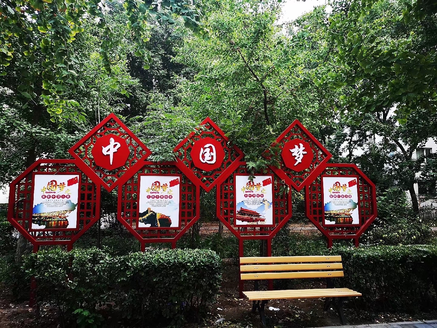 夏天,百草都很旺,更不用說樹葉茂盛,百花競放,蟬鳴鳥唱了。揀個心情好的時間,坐在這個連椅上剩涼,背靠著《中國夢》,做著自己美好的夢,說不定真會夢想成真呢!你還不快來……