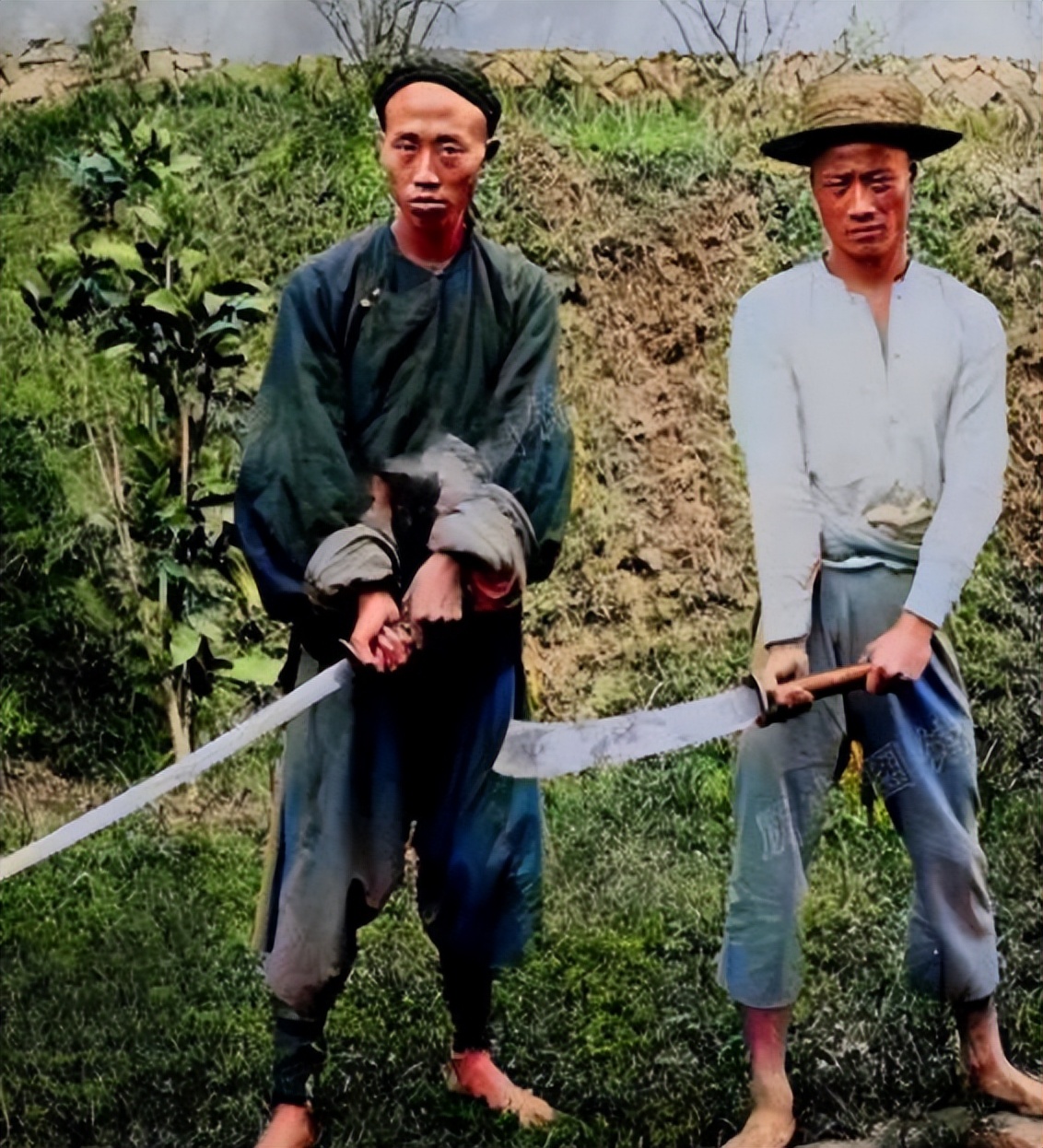 照片中這兩個人是清朝時期的劊子手,他們手里的刀正是行刑時要用的砍刀,看得人不寒而栗。