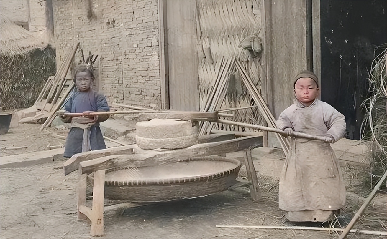 當時的生活條件,小孩子剛懂事的年紀就要幫著家里干活,照片里這兩個小孩子看起來也就是五六歲的樣子,就已經會推磨了。