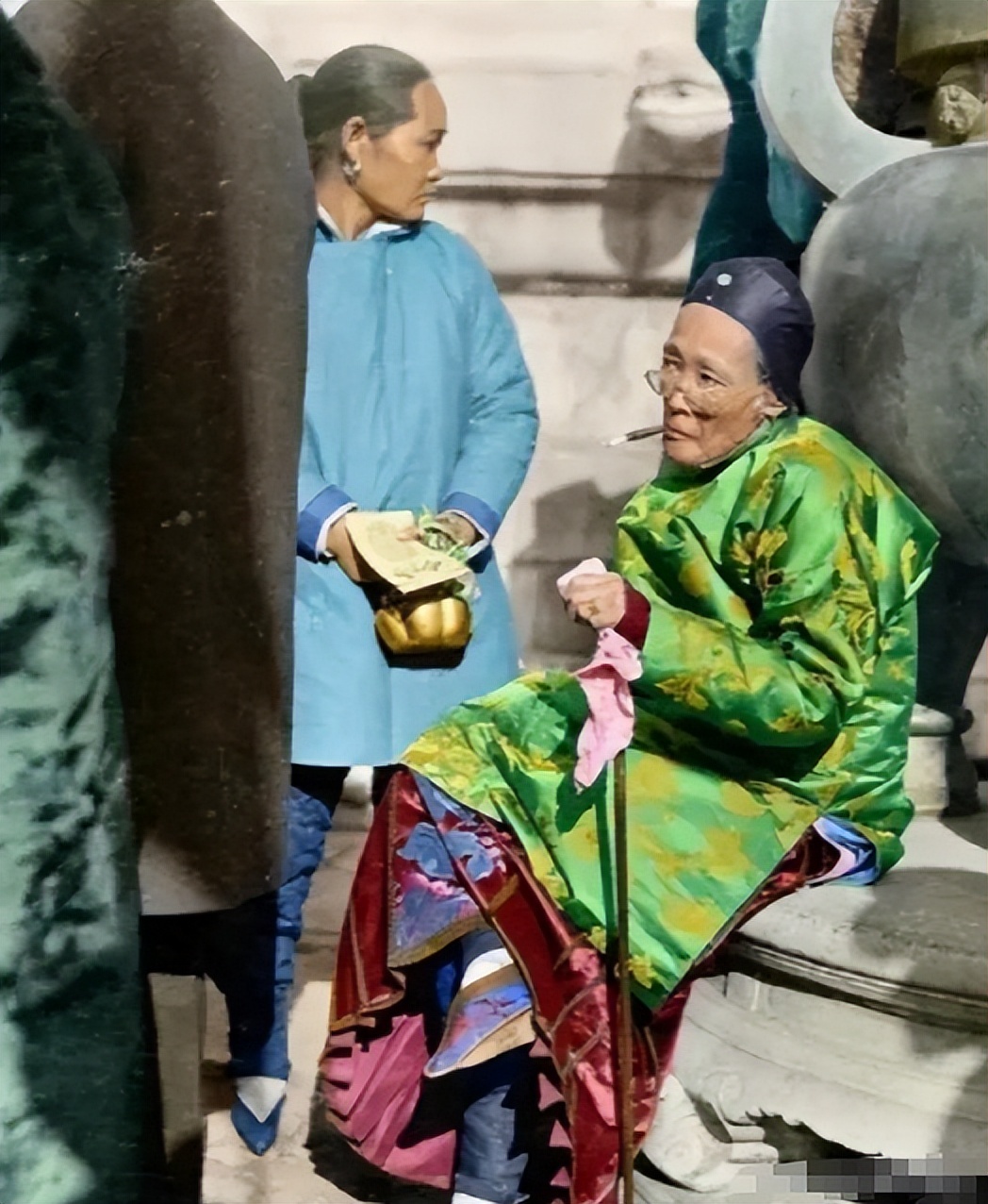 她死死地盯著前方,眼神犀利,嘴里還叼著煙卷,旁邊更是隨時有丫鬟伺候。