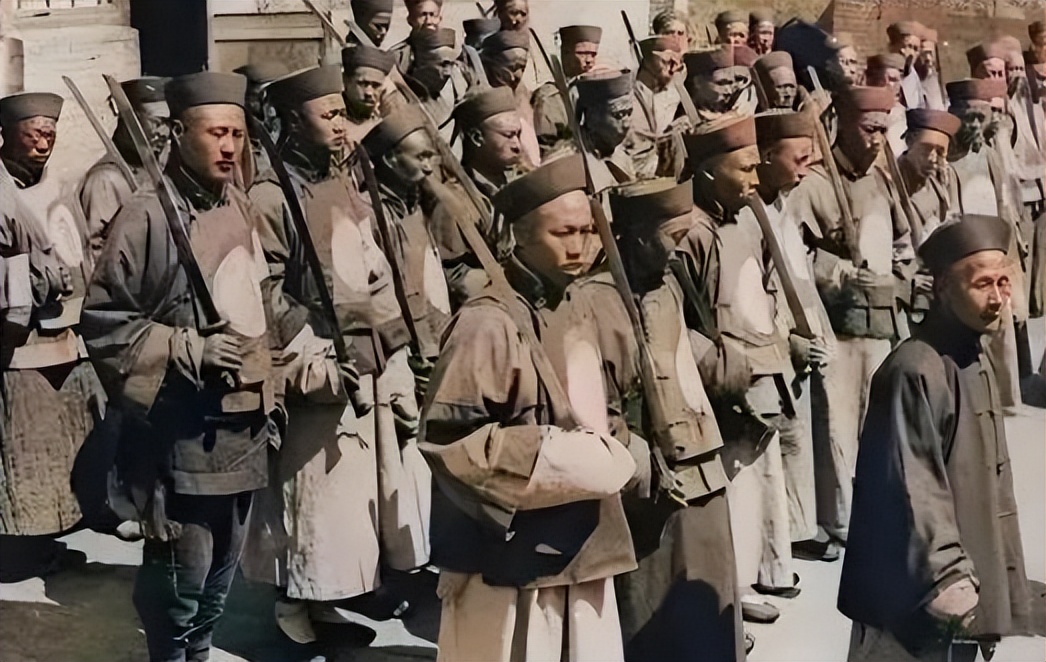 這是晚清時期軍中練兵的照片,但這些士兵看起來全都瘦弱不堪,而且完全沒有精神頭,一點軍人的樣子都沒有。