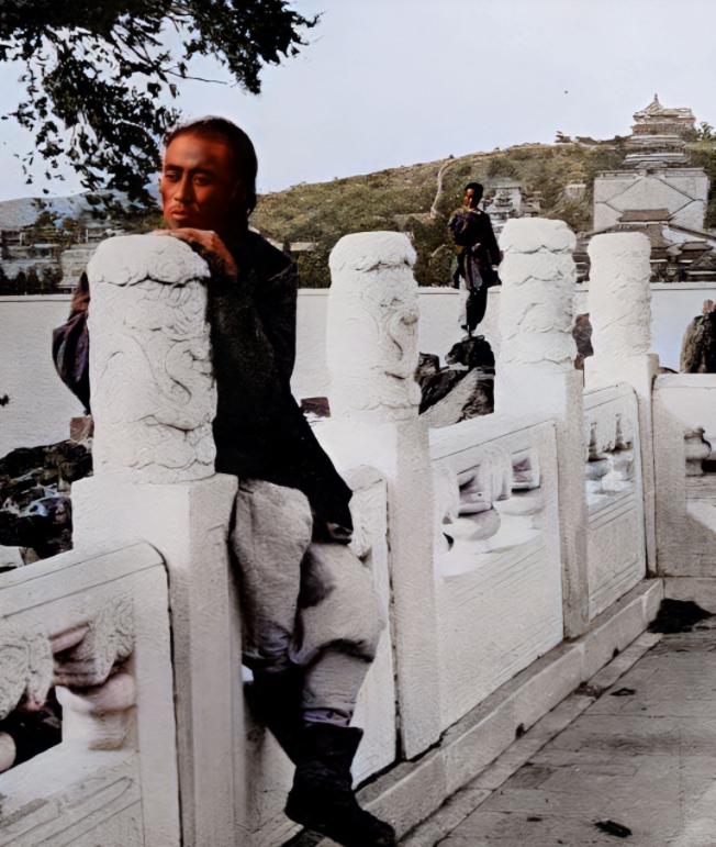清朝時期的頤和園,還有游人坐在石柱上發呆。