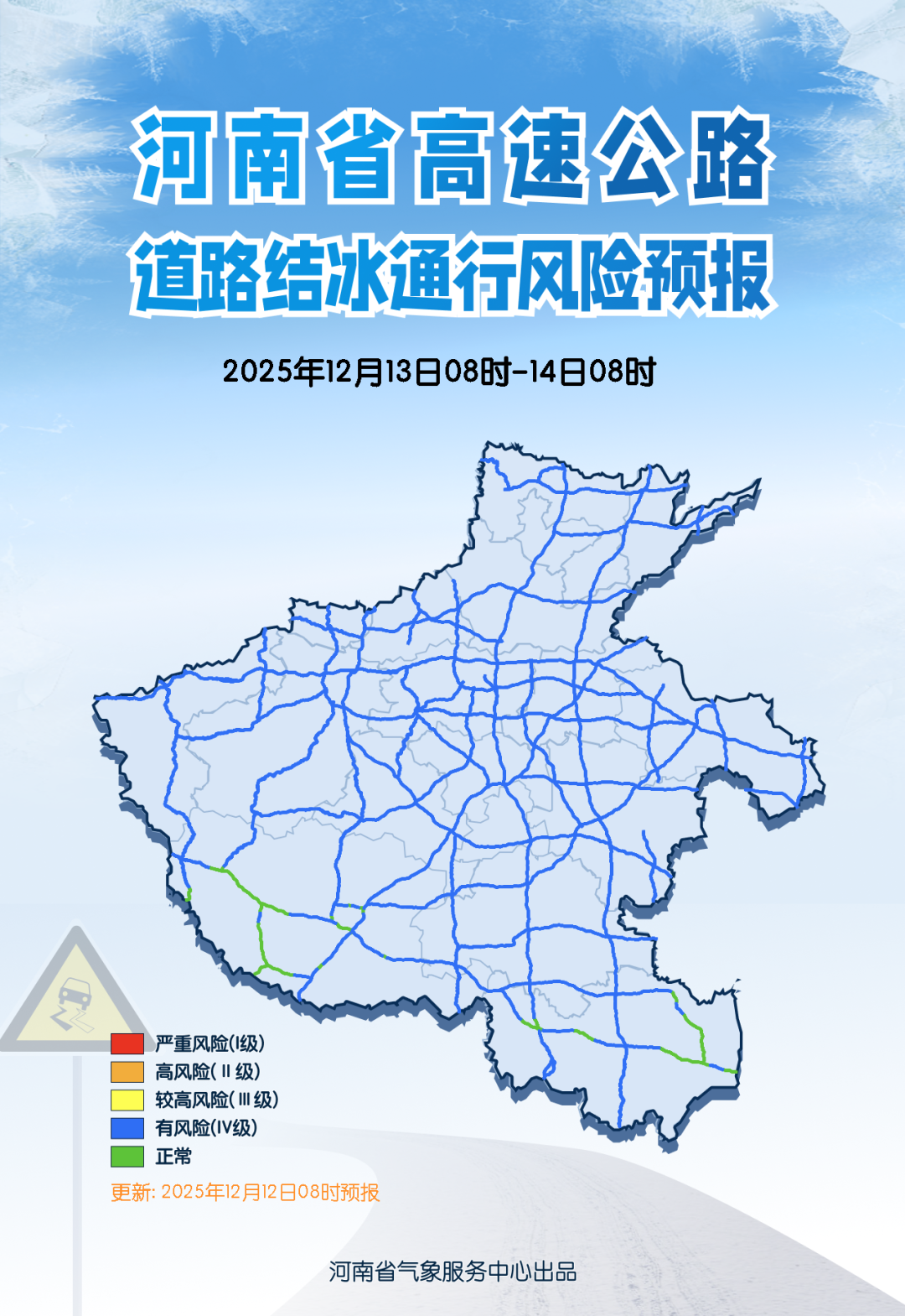 周口市氣象臺(tái)2025年12月12日16時(shí)發(fā)布道路結(jié)冰黃色預(yù)警信號(hào):預(yù)計(jì)未來24小時(shí),川匯區(qū),市城鄉(xiāng)一體化示范區(qū)和周口臨港開發(fā)區(qū)所轄全部街道可能出現(xiàn)對(duì)交通有影響的道路結(jié)冰,請(qǐng)注意防范。