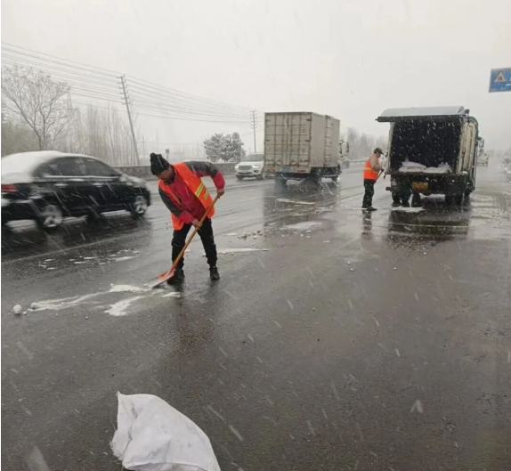 作業過程中,工作人員采用“機械為主、人工為輔”的作業模式,駕駛車對豐收路石河橋、金城南水北調橋、柏山電廠石河橋、許良丹河橋、鴻昌路泉組河橋、博王路等進行均勻播撒,針對護欄縫隙、橋面邊角等機械盲區,通過人工定點拋撒的方式補位,確保融雪鹽用量精準、覆蓋全面。同時,現場安排專人對作業區域周邊排水口進行臨時封堵,防止含鹽水流入綠化帶或市政管網,并同步開展路面巡查,實時監測融冰效果與環境影響。