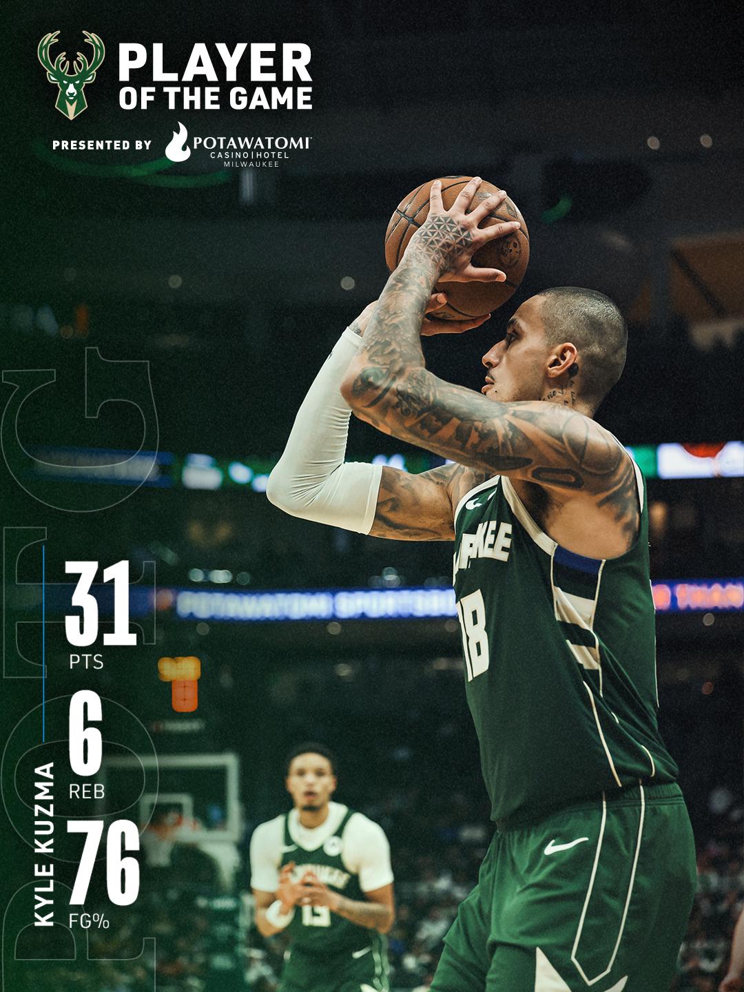 雄鹿隊鋒線悍將凱爾庫茲馬,在此役迎來了暴走。庫茲馬上場31分鐘,17投13中,三分2中1,罰球5中4,狂轟31分6籃板1蓋帽的全能數(shù)據(jù)。庫茲馬以76%的命中率轟下了全場的最高分,在進攻端徹底打瘋了。庫茲馬還搶下了全隊第二多的籃板球,在防守端拼盡全力。此外,庫茲馬的正負值+12高居全場第三。