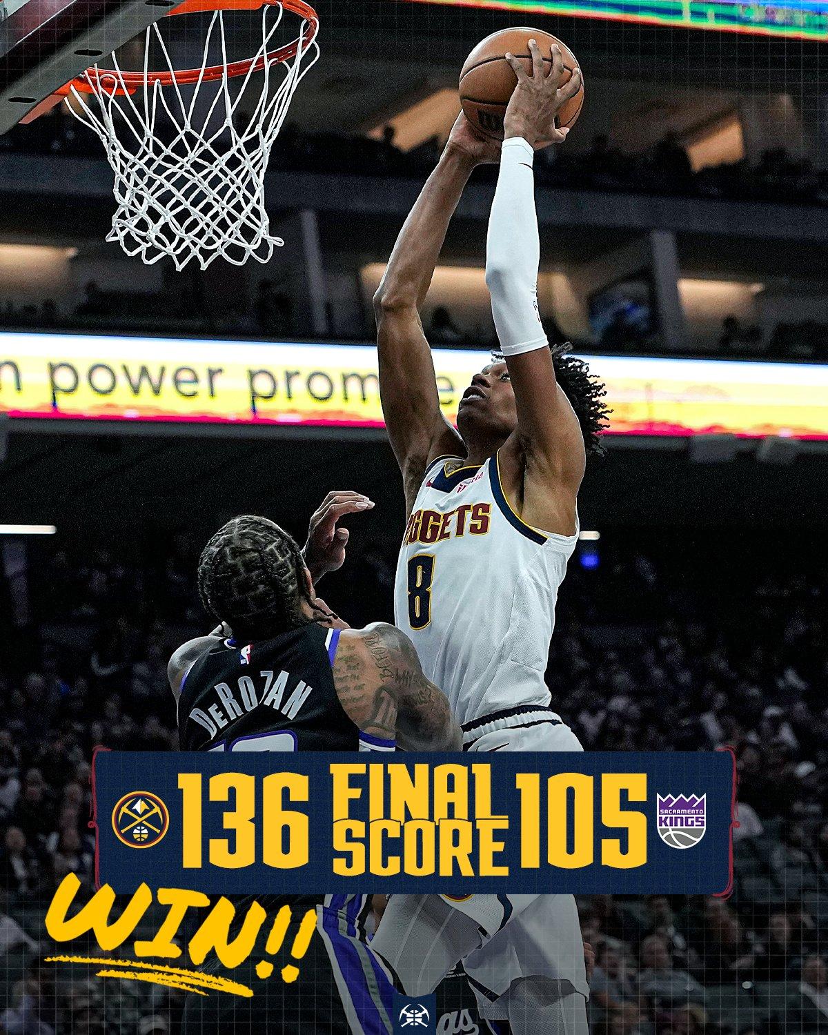 掘金隊,沃特森10中7高效的砍下了21分2板1助、卡梅隆約翰遜13中6得到16分3板1助、瓦蘭丘納斯7中7轟下了15分6板2助、小哈達威11中5,三分球6中1得到11分5板2助、賈馬爾穆雷13中4得到11分3板9助2斷、布魯斯布朗8分5板7助、泰森8分、皮克特6分5板4助2斷、斯潘塞·瓊斯2分3板1助、納吉2分2板。